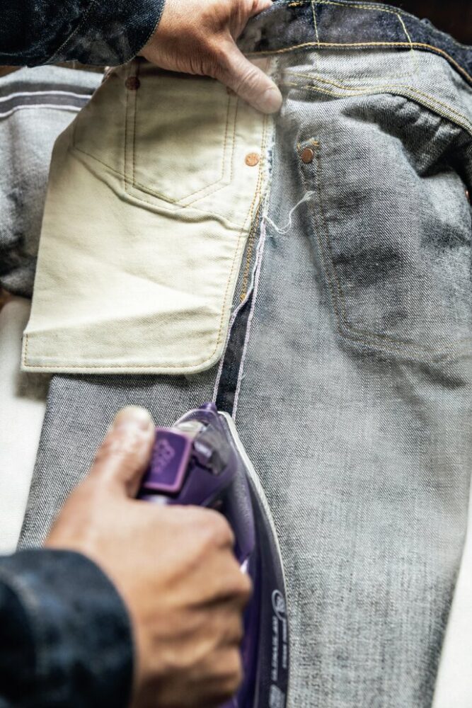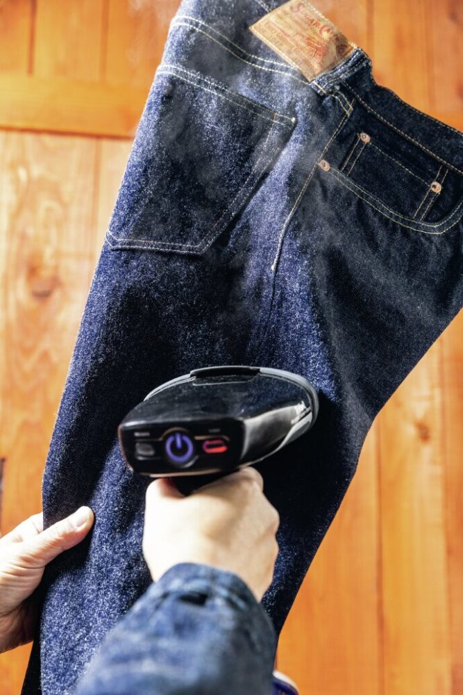 吊るしの保管が理想ではあるが、すべてを吊るしで保管するのは難しいだろう。畳みのデニムには着用前にスチームを当てることで、畳みジワがそのままアタリになってしまう事態を防げる。合わせて洗濯後にアイロンで耳を開くことを習慣づけるとより美しいアタリに近づく。