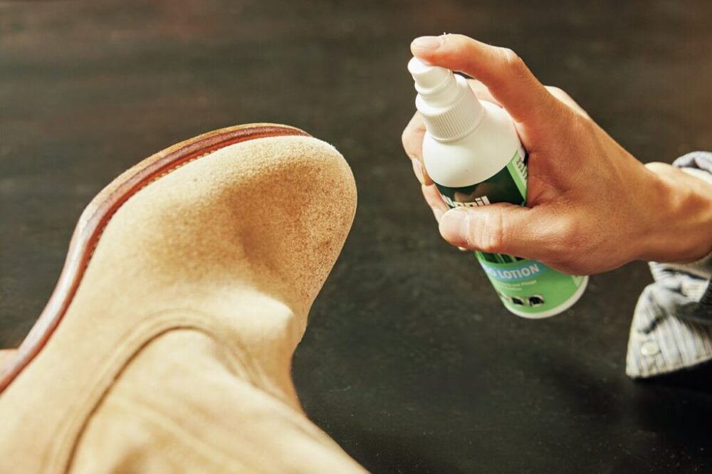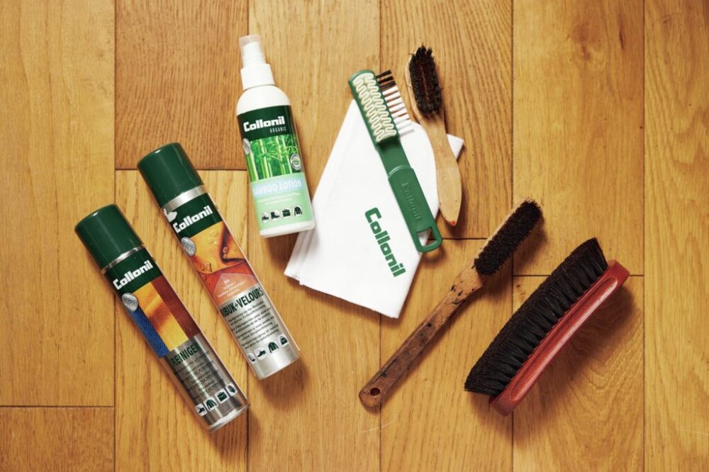 馬毛ブラシ、柄付きブラシ、金ブラシ、クレープブラシ、バンブーローション、起毛皮革用防水スプレー、クレンジングスプレー、クロス