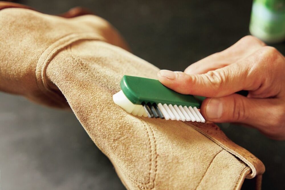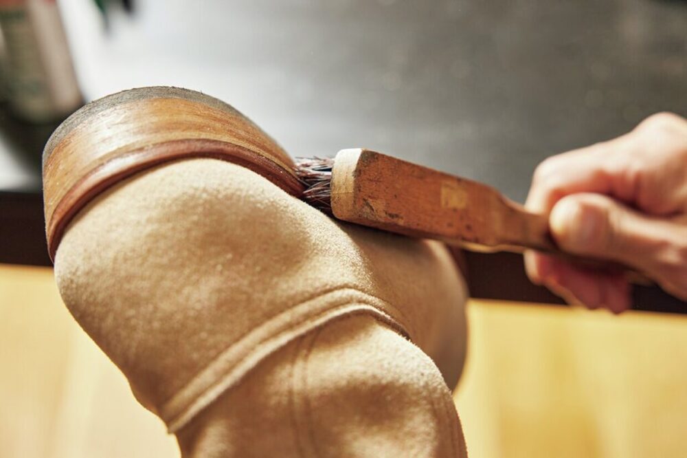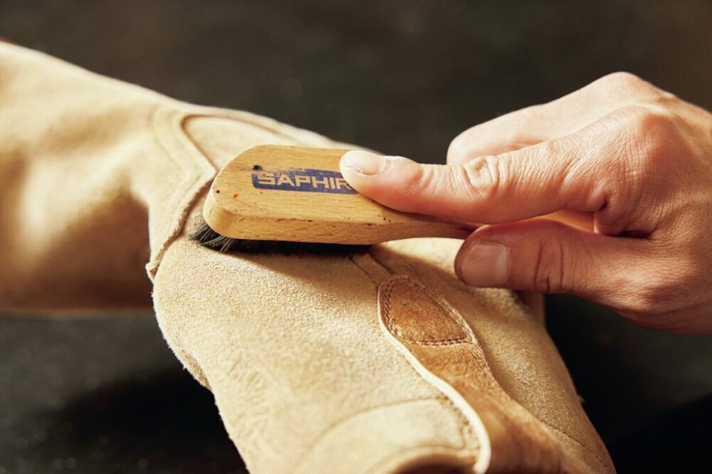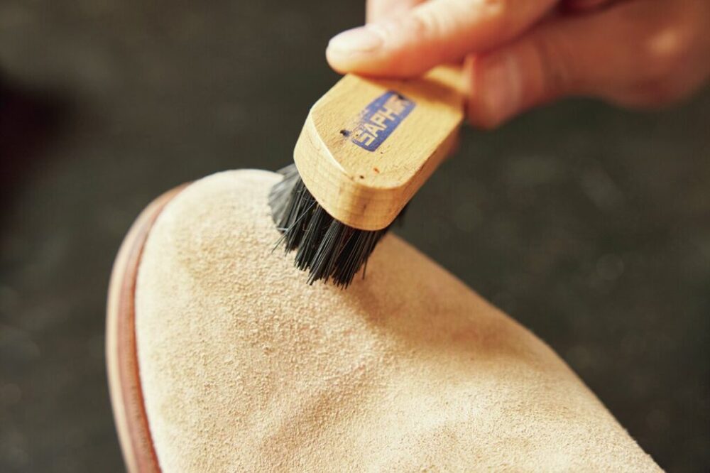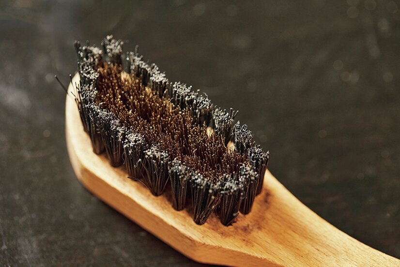 金ブラシは、毛先に適度な硬さとしなりがあり、革そのものを削りにくいためスウェードは最適。特に周りにナイロンのブラシがついたタイプは一本あれば重宝する。