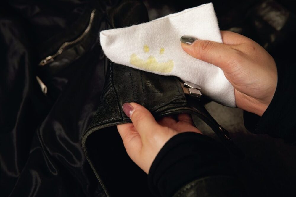 埃を落としたら、レザーに付着した汚れをクリーナーで取っていく。レザーによってはクリーナーがシミになる可能性もあるので、目立たない箇所で確認を。ゴシゴシするのでなく、丁寧に拭き取っていくイメージで。