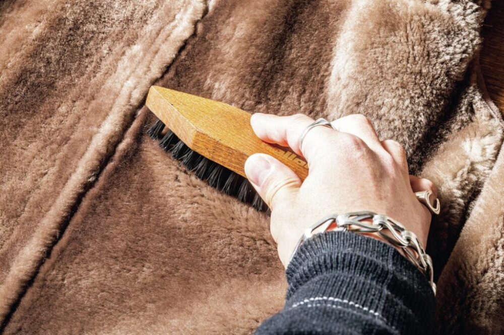 王道のクマジャンは、スムースレザー部分は前頁と同様にして、ムートン部分はブラッシングが基本。変色の恐れのあるフッ素系のスプレーは避けたい。
