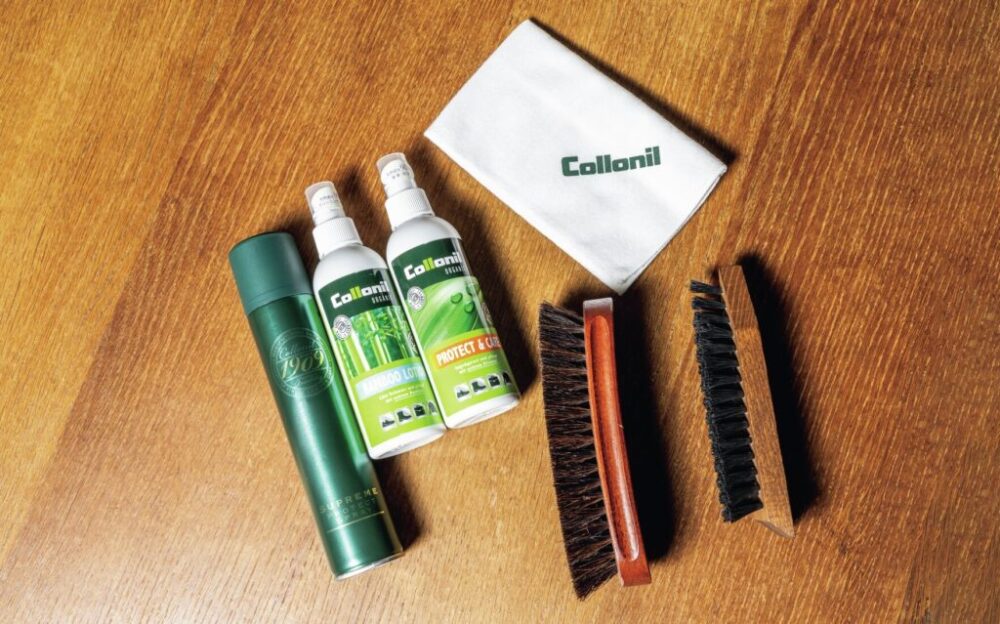 コロニルの防水スプレー2,530円、バンブーローション2,640円、プロテクト&ケアスプレー2,640円、クロス660円(すべてアトラクションズ Tel.03-3408-0036)、仕上げ用馬毛ブラシ、ほこりをかき出すための馬毛ブラシ