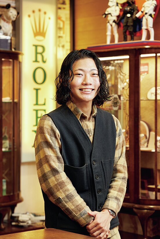「スイートロード川崎本店」スタッフ・中嶋翔さん|販売と日常的なメンテナンス業務を担当し、現場で経験を積みながら時計の基礎を学んでいる。休みの日にはヴィンテージの愛車でキャンプに行くのが楽しみ。