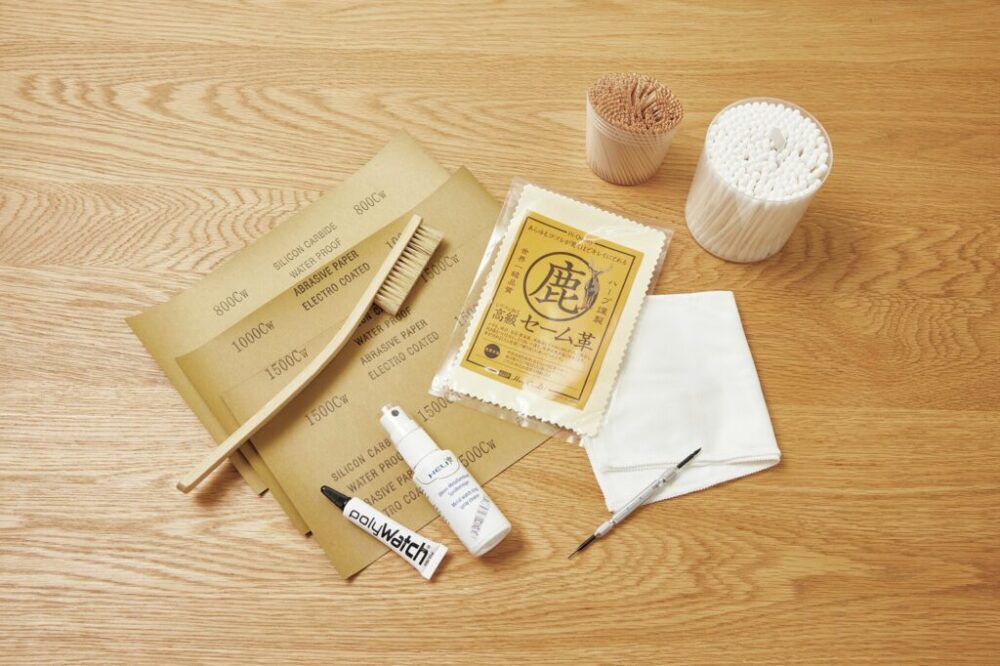綿棒、爪楊枝、セーム革、紙やすり(#800・#1000・#1500)、豚毛ブラシ、ポリウォッチ、メタルバンドクリーナー、バネ棒外し、布