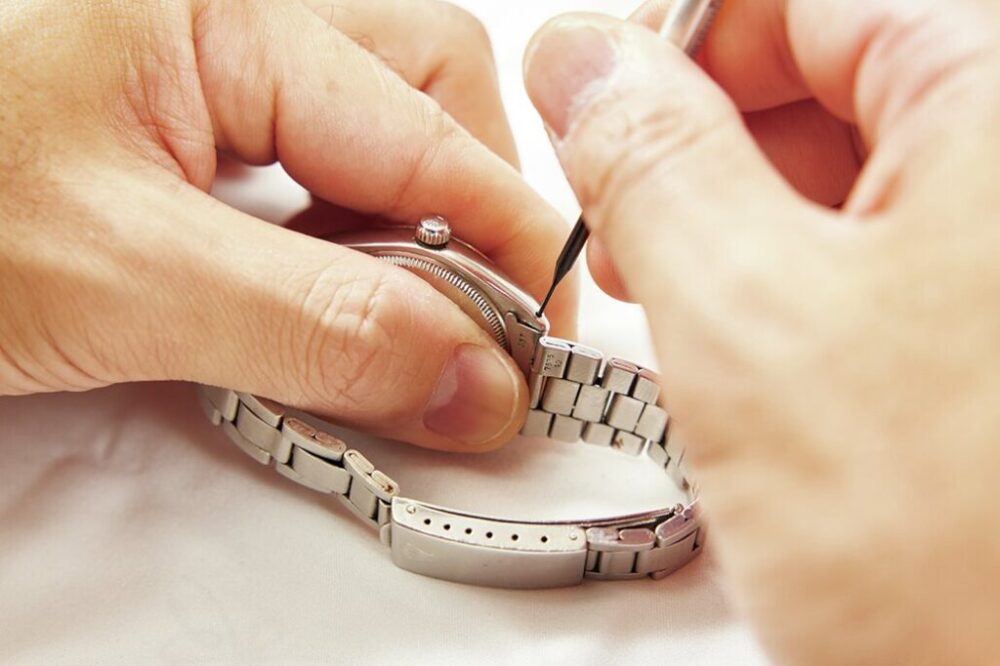 まずはバネ棒外しを使い、時計本体からベルトを内側方向にスライドして外す。バネ棒が勢いよく飛ばないように注意。