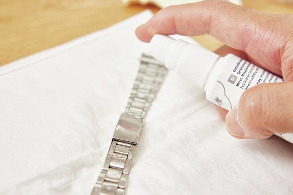 ティッシュの上にベルトをおき、メタルバンドクリーナーを両面に満遍なく噴射。2分ほど待つとかなり汚れが浮き出てくる。