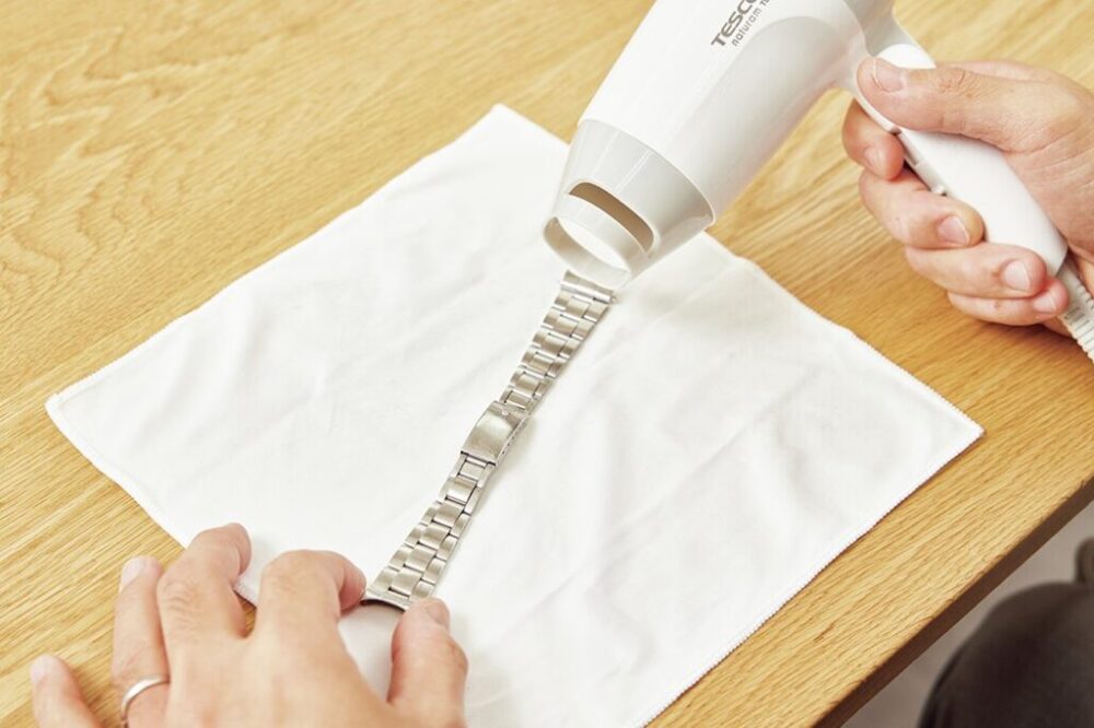 しっかりと水気を拭き取り、ドライヤーで風を当てて乾かす。少しでも水が残っているとサビや汚れの原因になるので注意。