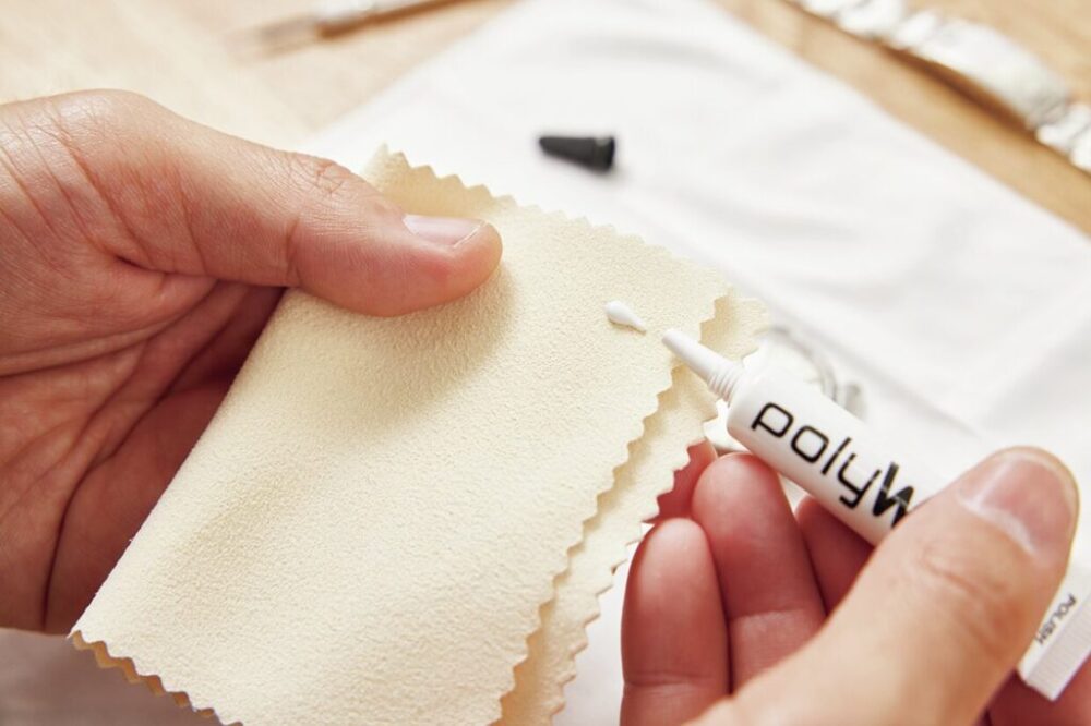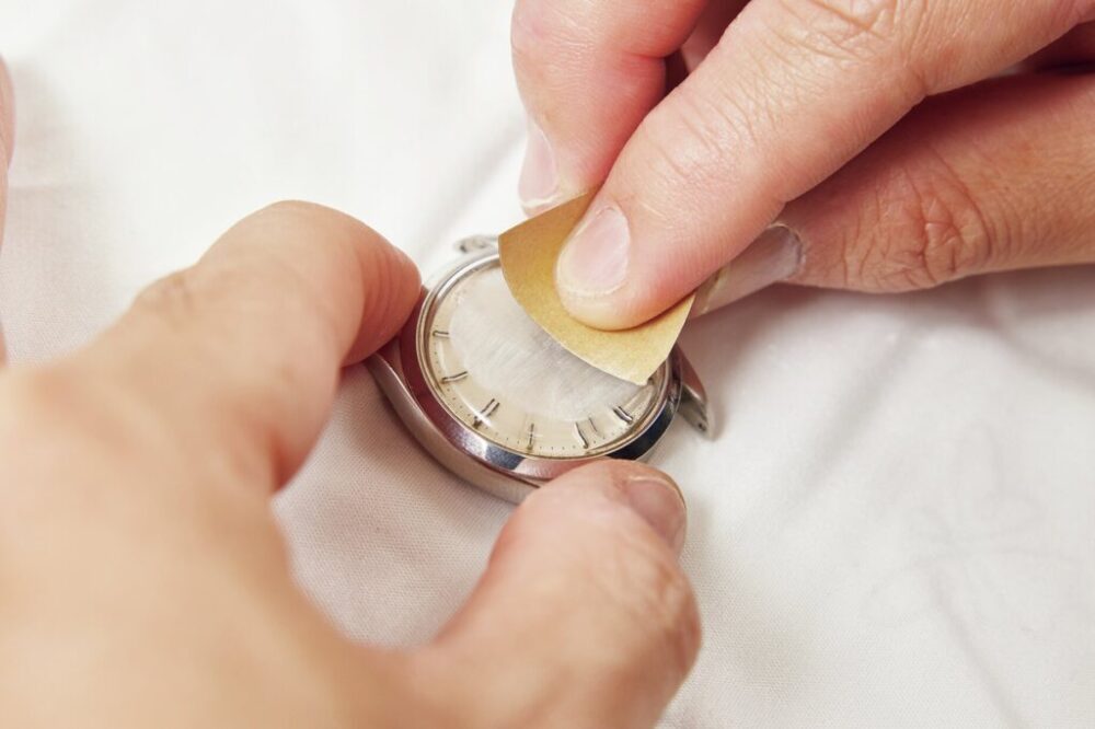 風防用研磨剤であるポリウォッチを米粒大にセーム革にとり、円を描くように磨いていく。このとき傷がまだ残っているようなら、再度紙やすりでの研磨を行う。