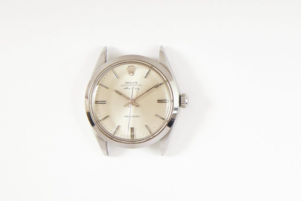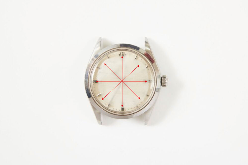 ヴィンテージ時計などのプラスチック製の風防なら磨いてキレイにすることも可能。#800→#1000→#1500と徐々に細かい紙やすりに変えて研磨。一方向に磨くと風防の形状が変わってしまうので必ず方向を変える。端はベゼルを傷つけるので避ける。