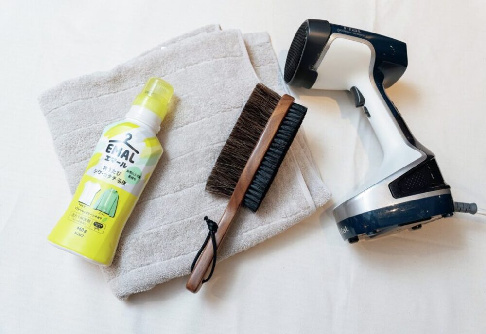 タオル、中性洗剤、馬毛ブラシ、スチーマー。
