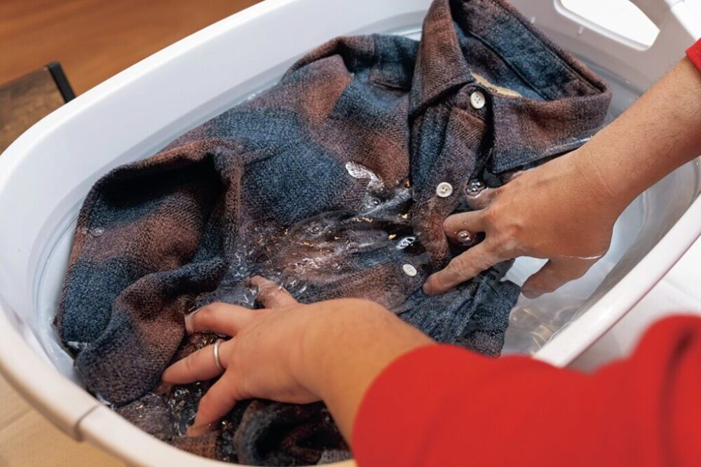 桶に30℃程度のぬるま湯を用意して、生地への負担が少ない中性洗剤を適量入れる。ネルシャツを浸したら両手を使って優しく押し洗いする。
