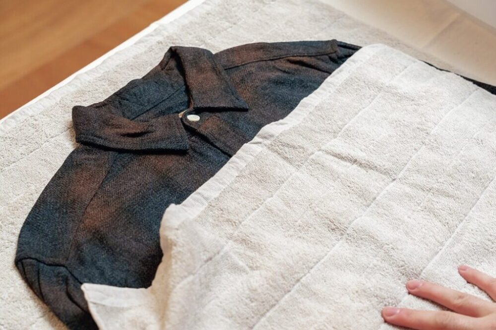 大まかに脱水をした後は、乾いたバスタオルの上にのせてしっかりと脱水する。バスタオルは双方に色移りの可能性がないものを準備する。