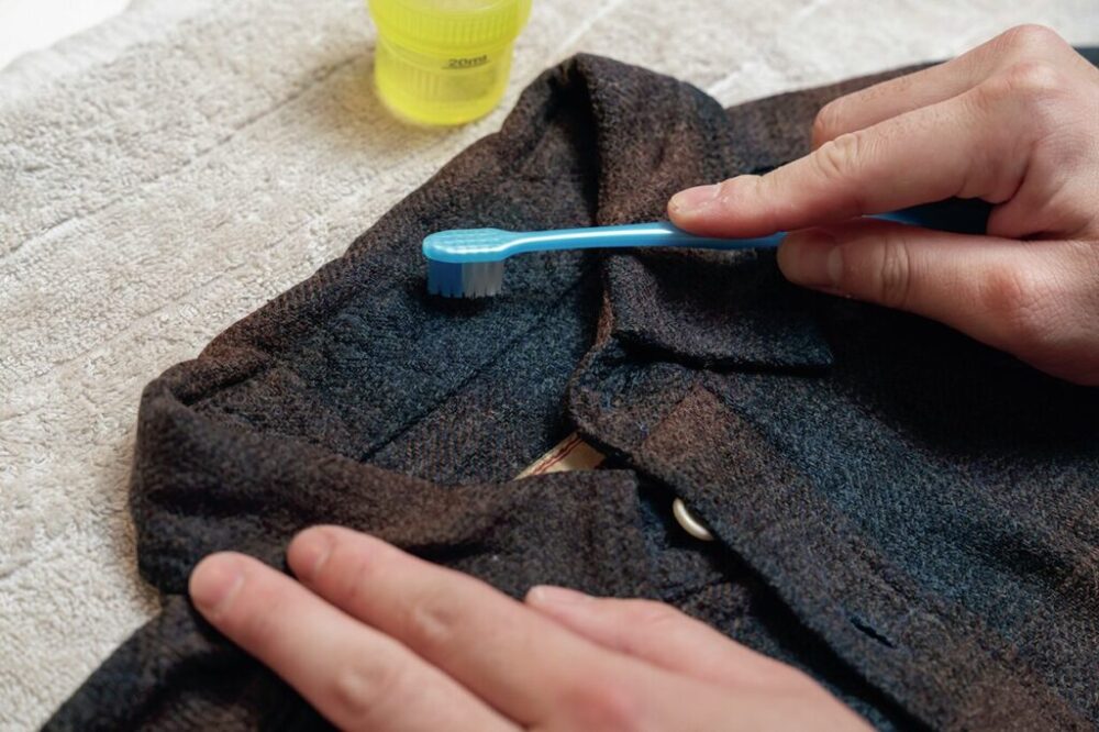 皮脂汚れが付きやすい襟や袖部分、または飲食物が着いてしまった部分など、汚れが気になるところには洗剤を原液で直接付けて、歯ブラシでトントンと叩く。