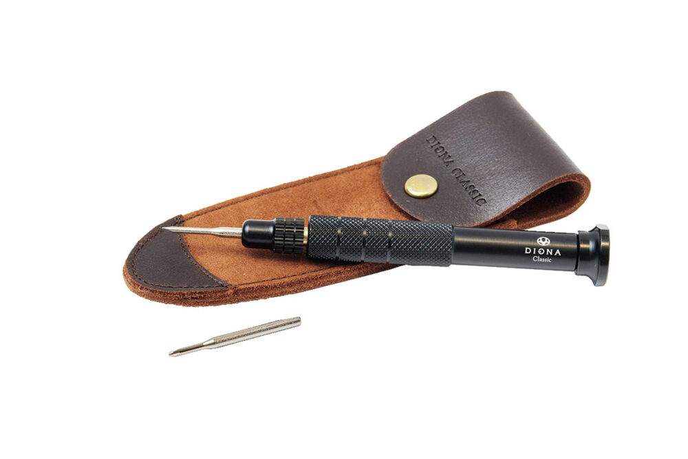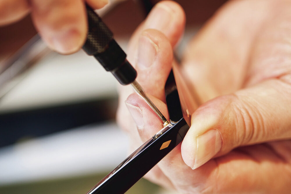 繰り返し着用することで、フロントとテンプルの繋ぎ目にあるヒンジというパーツのネジが緩む。これを修正するのは専門家の領域と思われがちだが、メガネ専用ドライバーが市販されているので自身で閉めることも可能。ネジ締めの際、空いている手はレンズを傷つけないように包みこもう。ポータブルドライバー6,600円/ディグナ クラシック(ディグナハウス原宿 Tel.03-5843-1612)