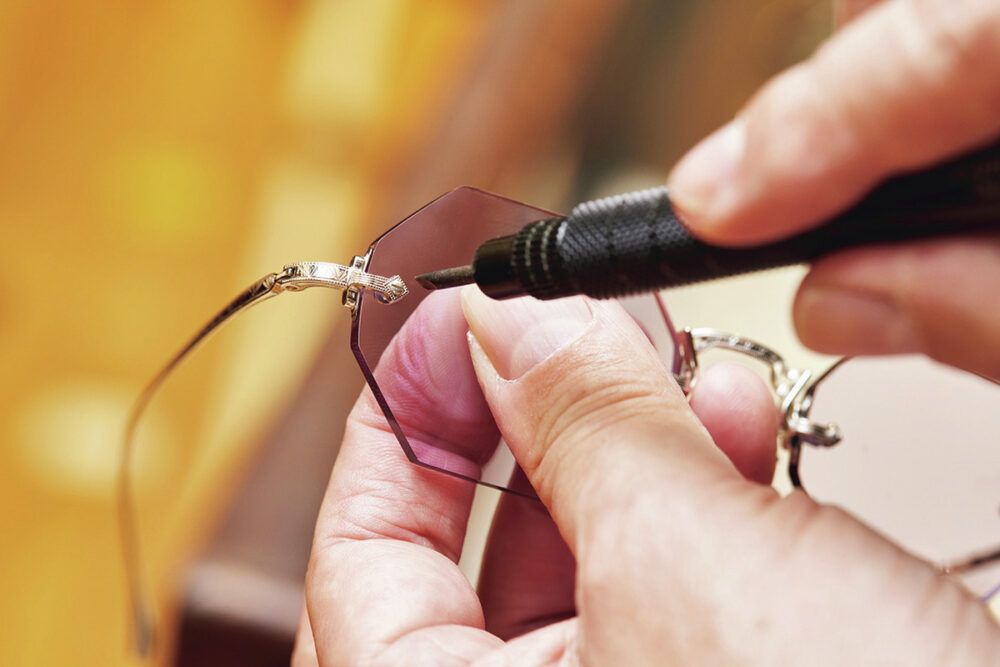 リムレスのネジの調整は非常に難しい。自力で無理せずメガネショップに相談だ。左の写真のような持ち方で万一手を滑らせたら、レンズに傷がついてしまう。