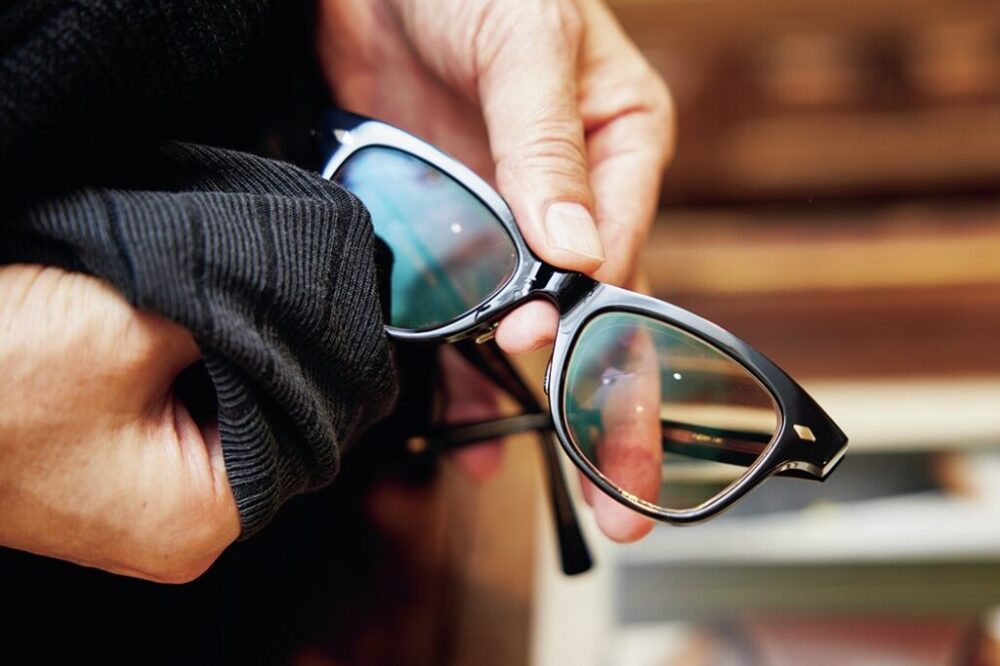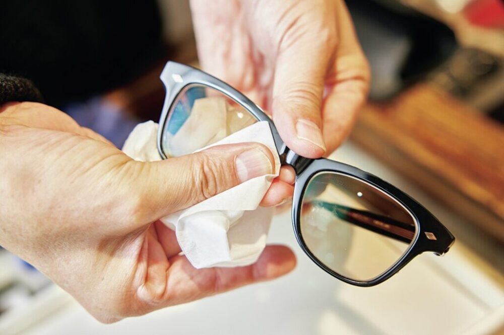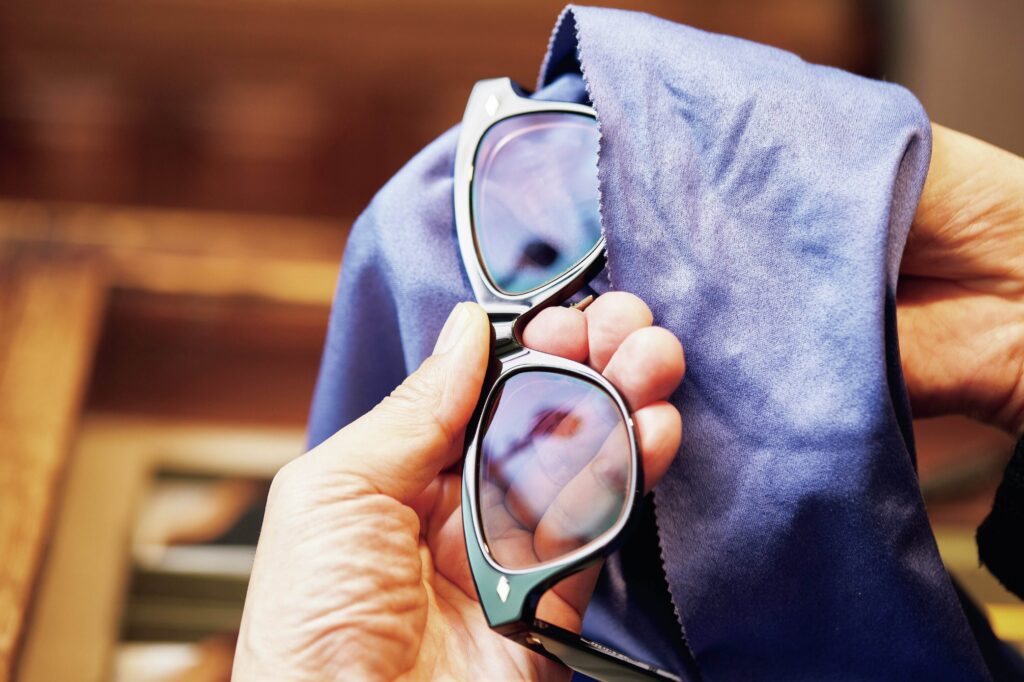 メガネ購入時に付属する簡易的なクロスで構わないので、全体を隅まで磨いていく。クロスも定期的に洗濯し、綺麗な状態を保ってあげよう。