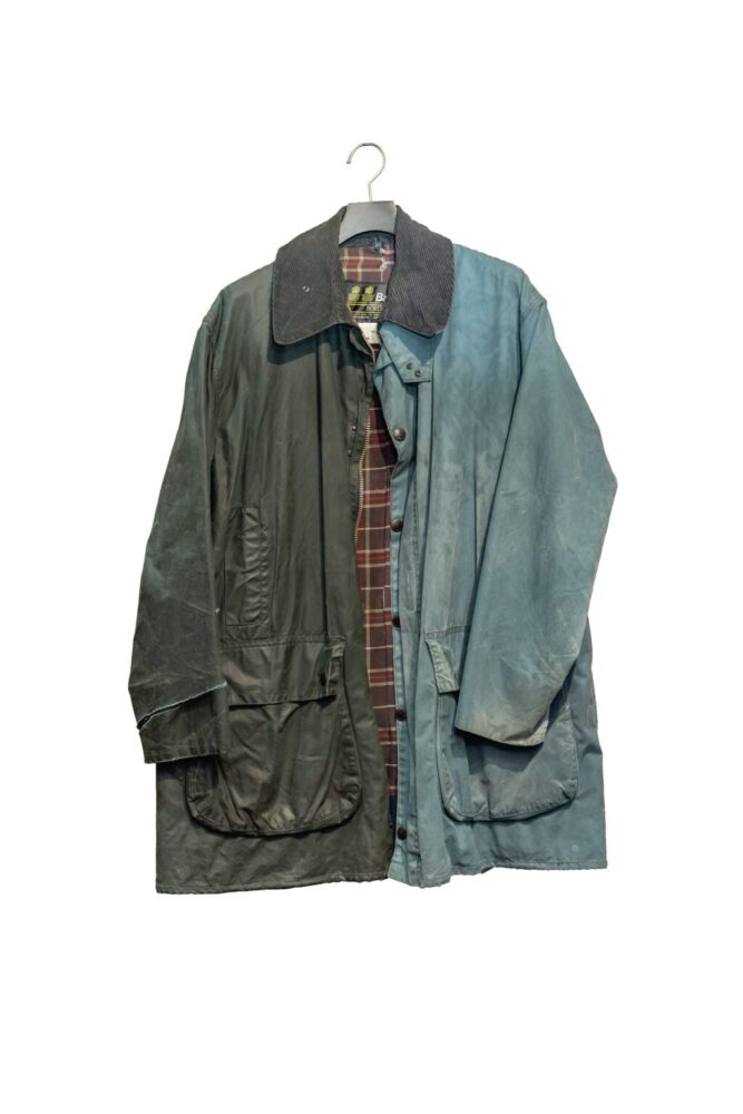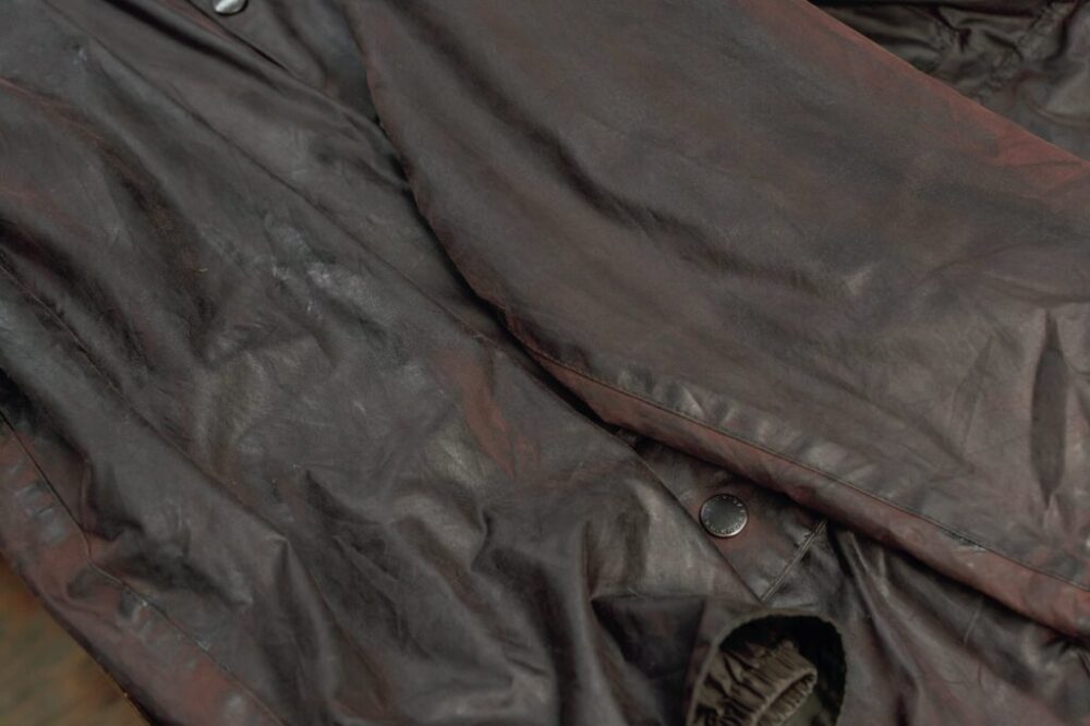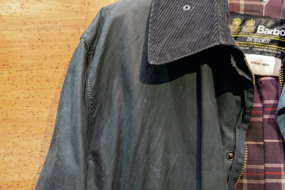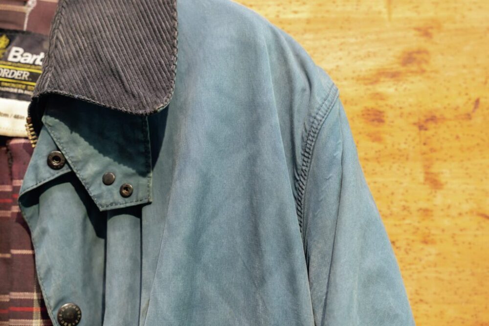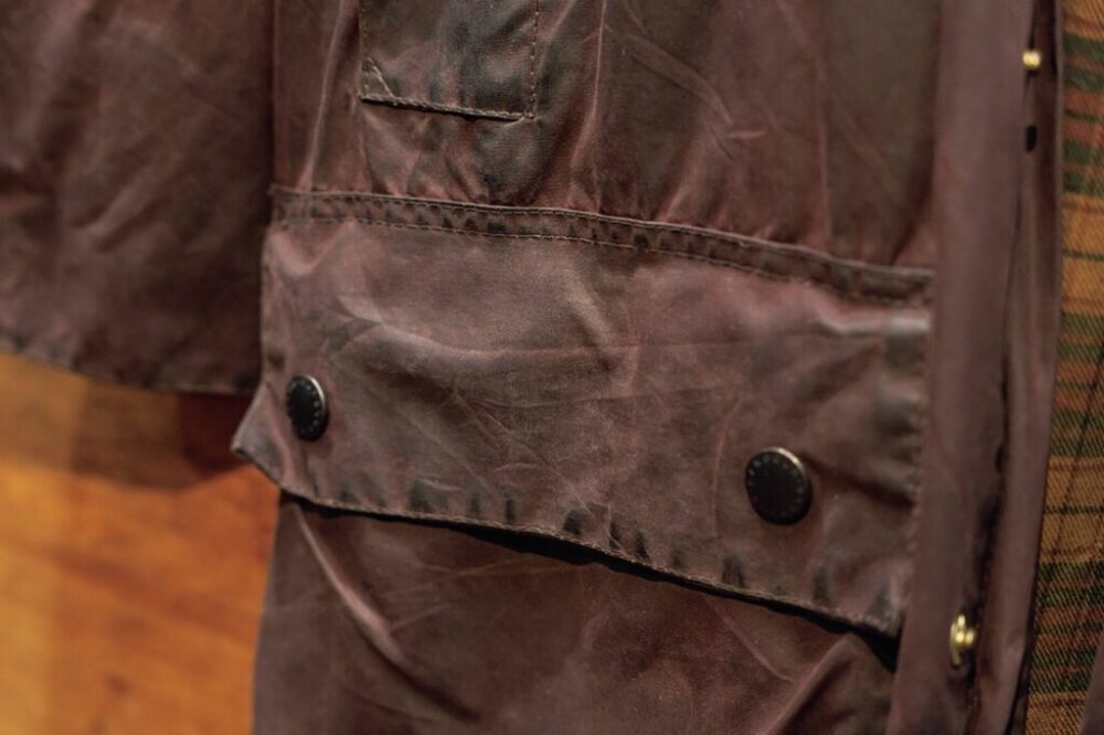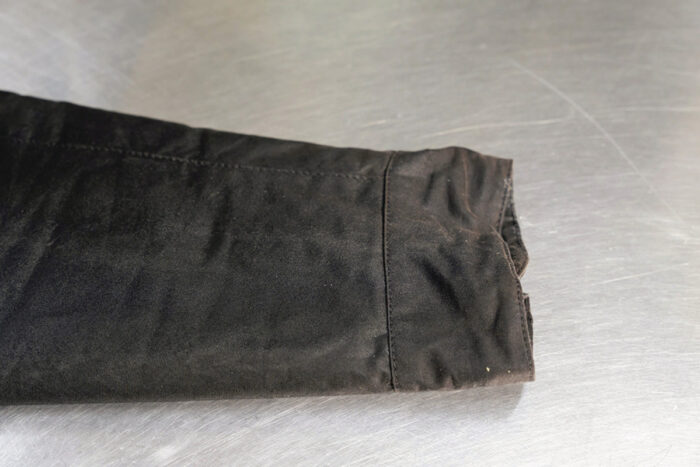 こちらのバブアーのジャケットは、長期間による天日干しで随所に日焼けやオイルのムラができてしまっている。完璧に戻るわけではないがリプルーフすることで元のブラックに戻り、良いエイジングに。部分的にやってみるのもオススメ。