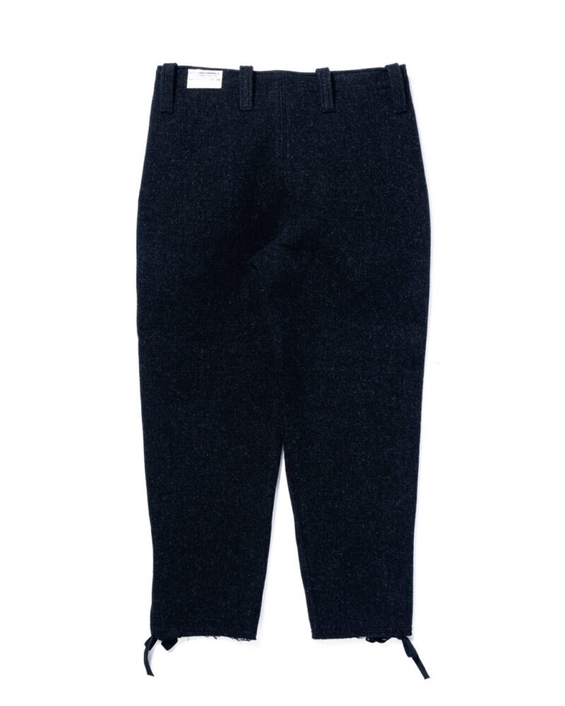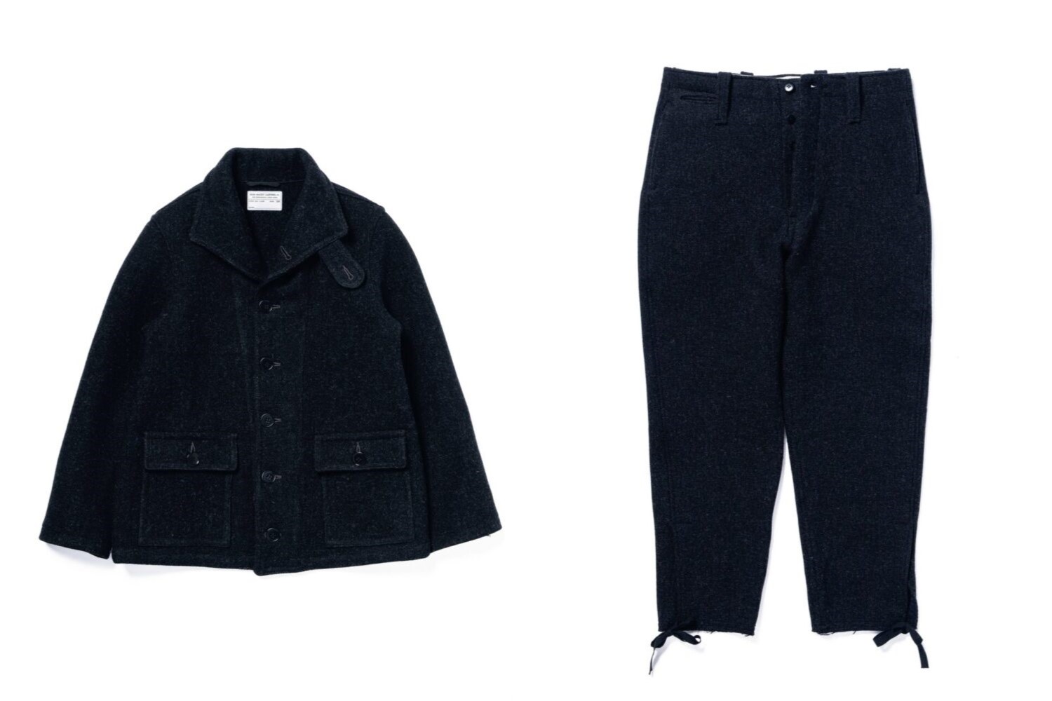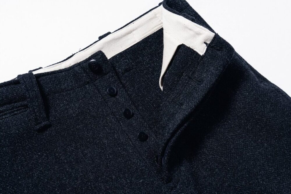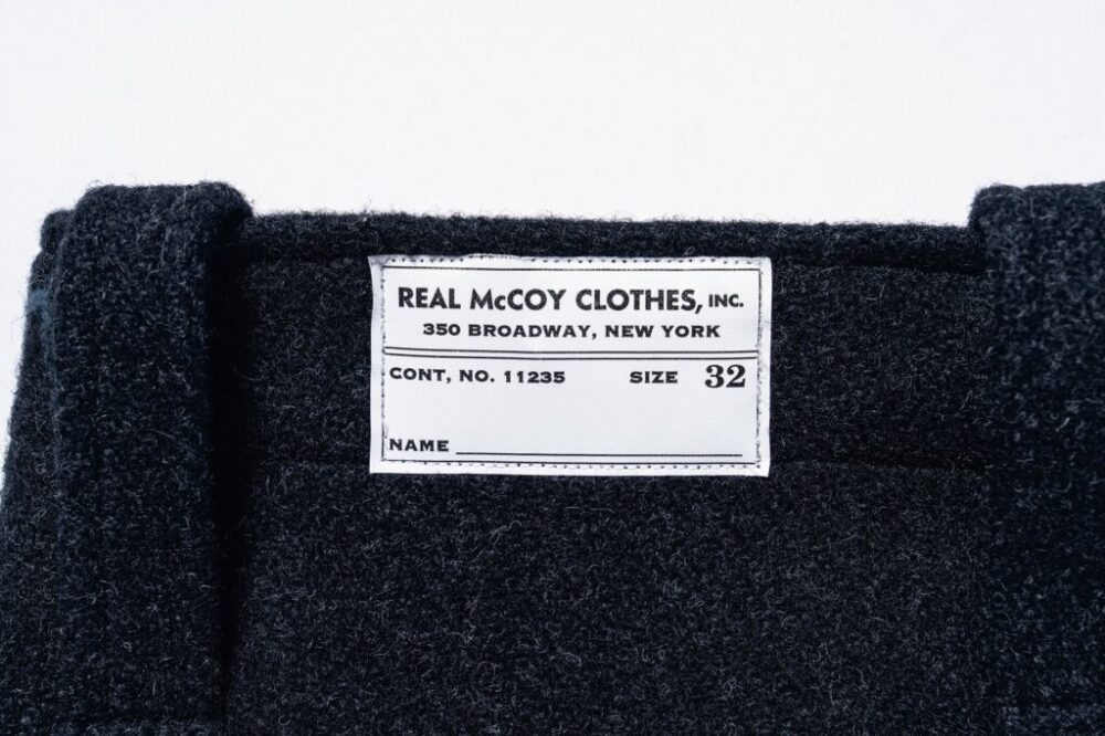 潜水艦乗組員に支給されていたサブマリン・コートとセットのトラウザーズ 。サブマリナーは海軍において精鋭部隊と位置づけられていた。艦内での作業効率を考えたうえで生み出されたシンプルなデザインと、ドローコードやフロントのボタンフライといったワークウエアとしての高い機能性が特徴。また、使い込むほどに深みを増すナットボタン特有の味わいも楽しめる。