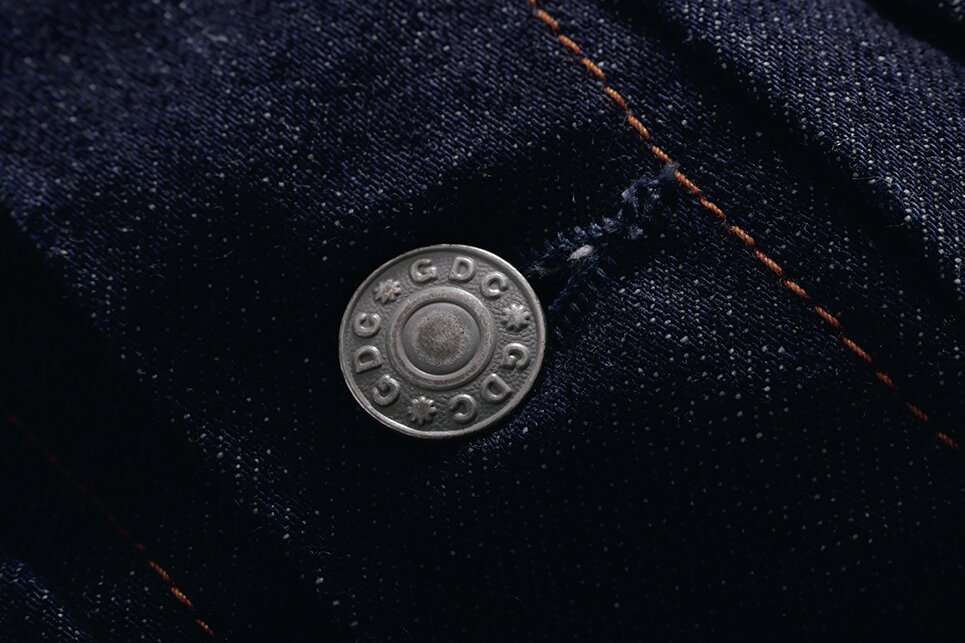ボタンやリベットなど金属パーツには、すべてブランド名が刻印されたオリジナル。ヴィンテージ由来のディテールをベースに、GDCならではのエッセンスが光る。