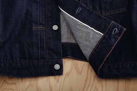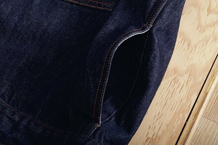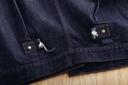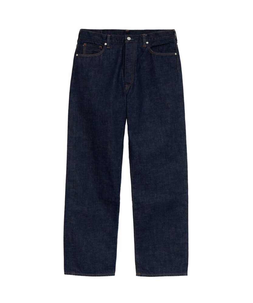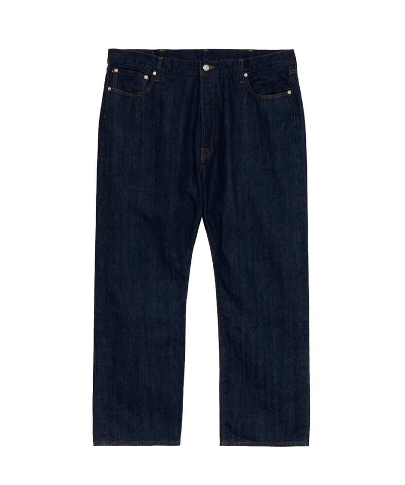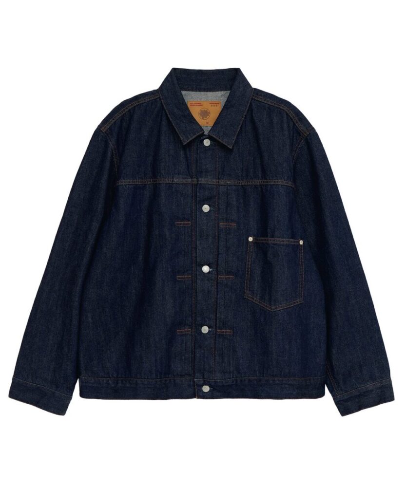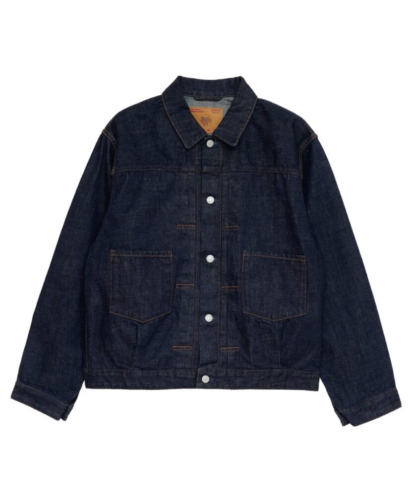 ヴィンテージの大戦モデルをモチーフにしたビッグシルエットのデニムジャケット。背面に接ぎのある通称、Tバック仕様やシンチバックを断ち切るなど、リアルに着用してきた雰囲気を演出。パンツはワイドストレートシルエットで、通常の5ポケットジーンズよりもベルトループを多く配した。ともにコットンカバーリングヤーンで縫製され、着用するたびに、生地と縫い目が馴染み、趣のある経年変化を楽しめるアイテムだ。¥49,000_/¥39,000_