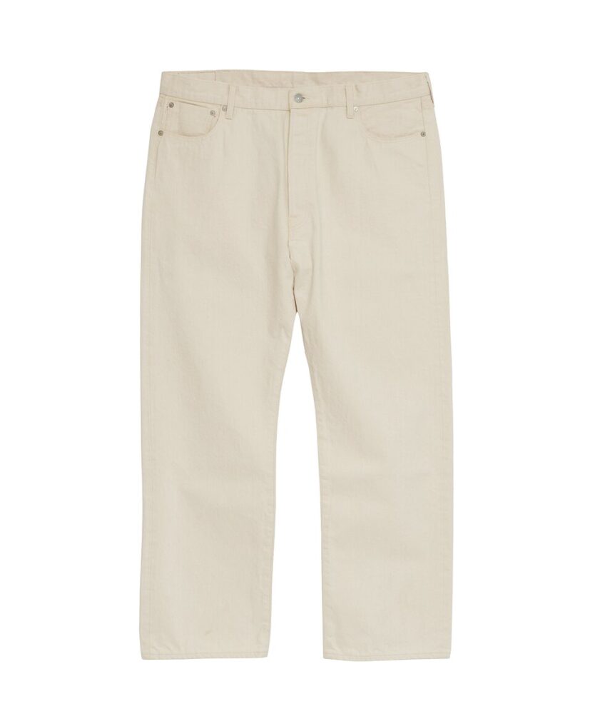 オフホワイトが新鮮で清潔感がありながら、武骨さも併せ持つデニムジャケットとジーンズのセットアップ。無染色に近いトーンが、デニムに軽やかな印象を与えている。ジャケットとパンツはインディゴデニムと共通のパターンを採用し、ゆったりとしたシルエットが色とともにリラックス感を演出。生地や縫製に至るまで高品質なジャパンメイドであるのはもちろん。着用を重ねることで表現されるホワイトデニム特有のエイジングも魅力のひとつ。¥49,000_/¥39,000_