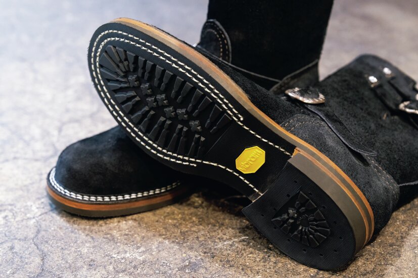 アウトソールにはビブラム#430を装備し、武骨な表情を保ちながら、街履きにも適した安定感と歩きやすさを高い次元で両立している。