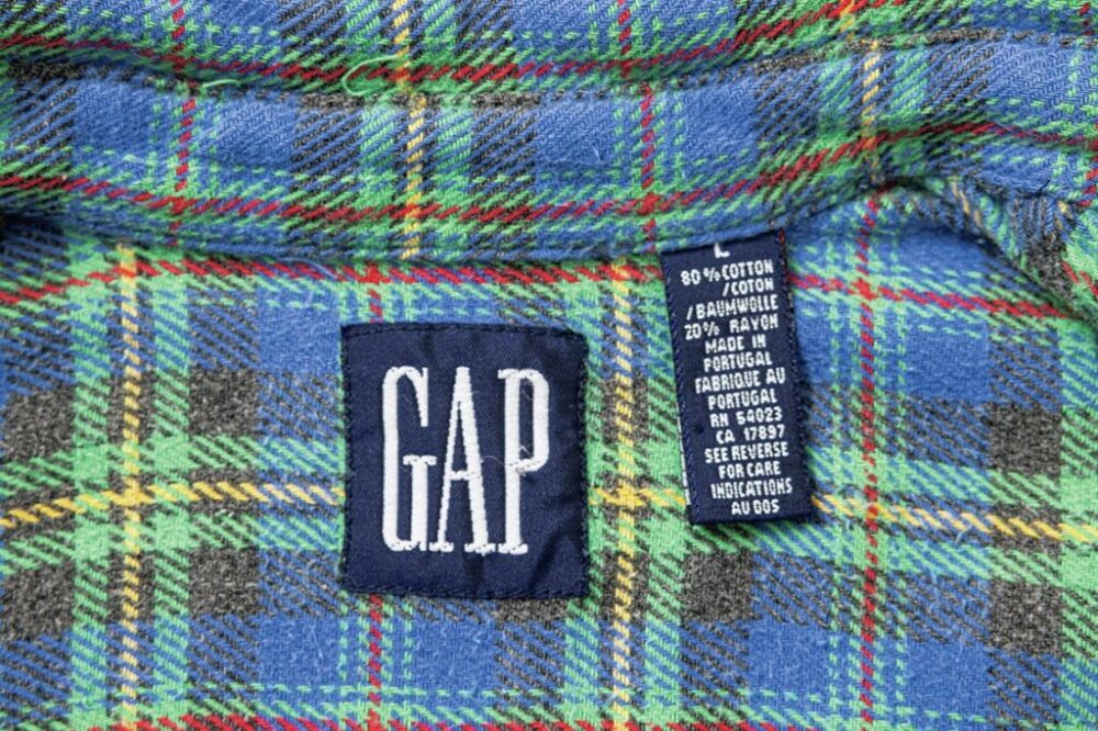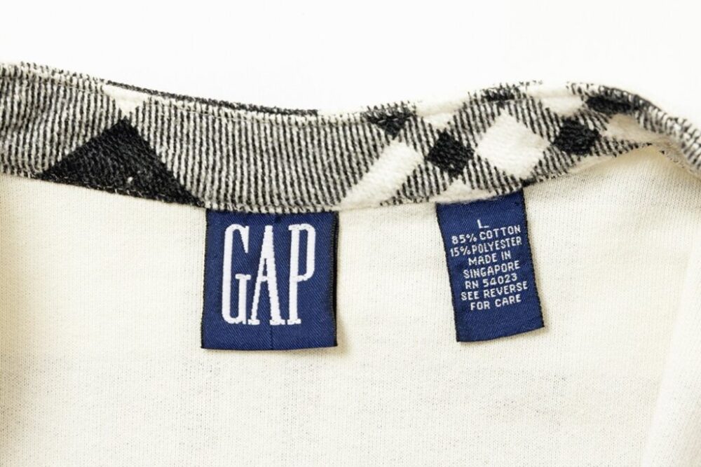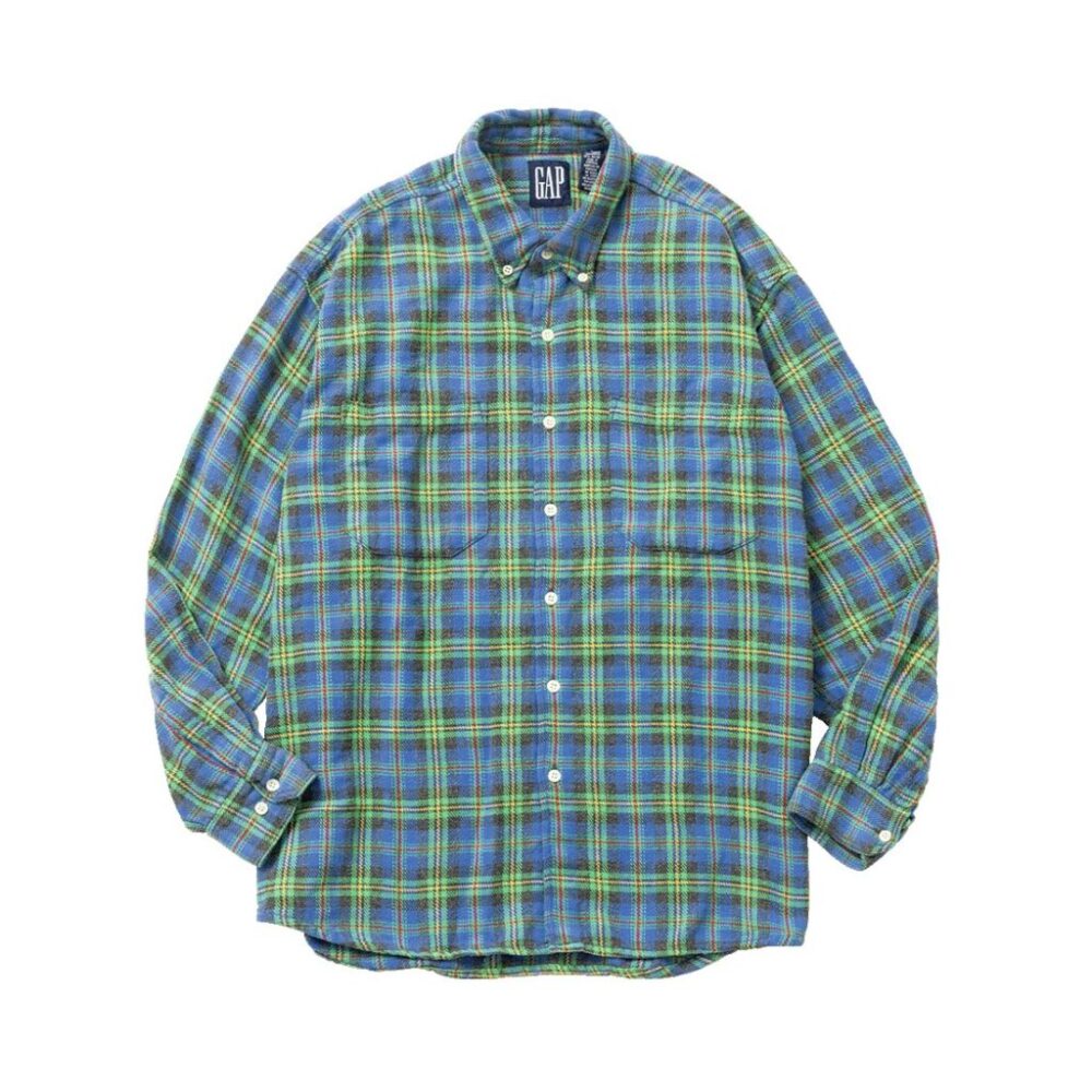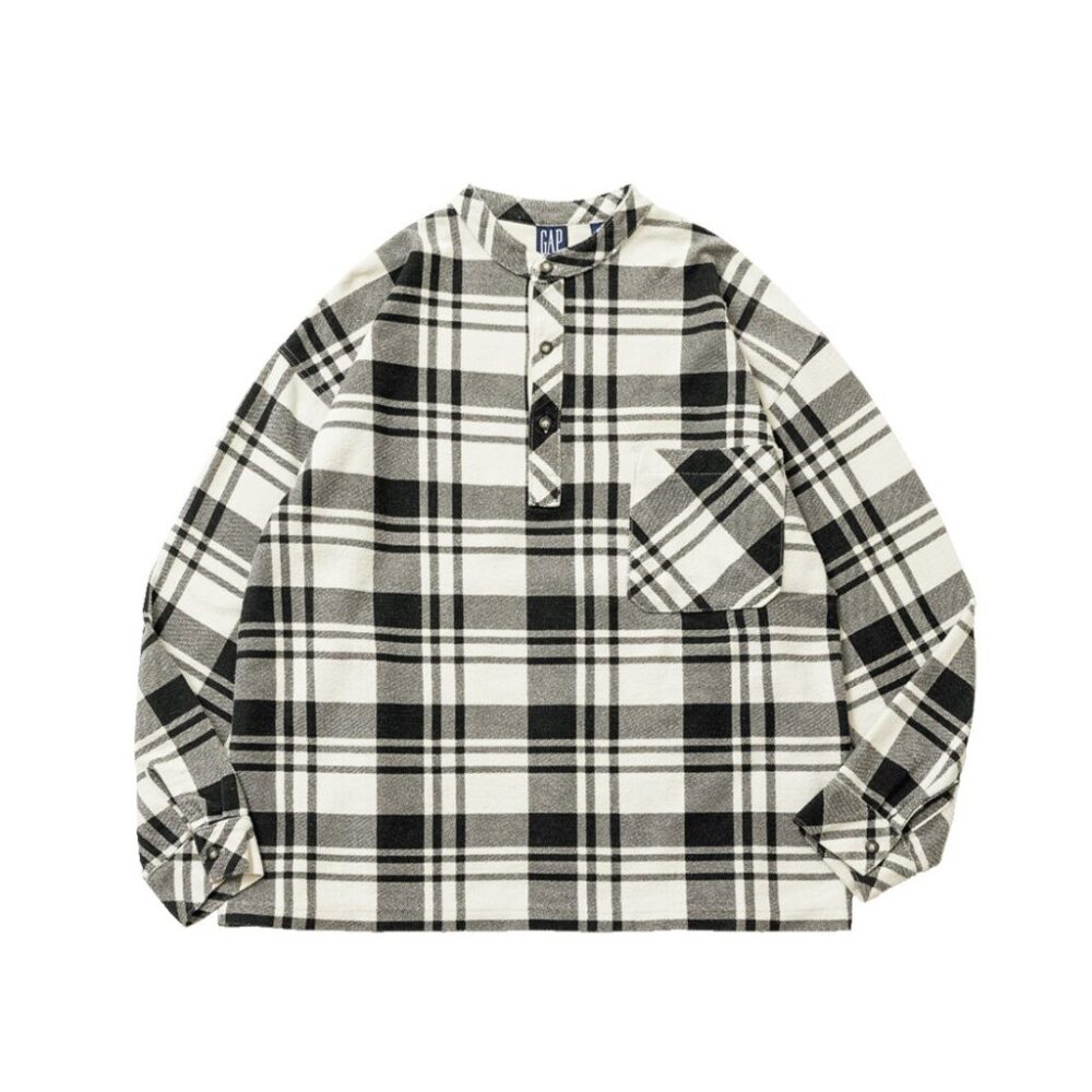 正方形でネイビーに白文字で大きくブランド名が入るタグはオールドGAP。ファッションとして作られたプルオーバー仕様のバンドカラーで、ブラック×ホワイトのチェック柄が印象的な1着。11,000円(ステップアヘッド原宿2 Tel.03-6427-5150)