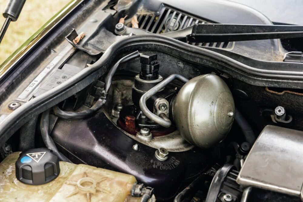エンジンルーム内のサスペンショントップに備わるのが、ハイドラクティブの油圧をコントロールするスフィアと呼ばれるパーツ。