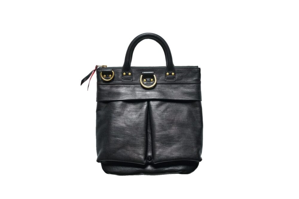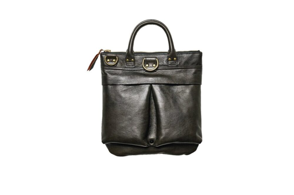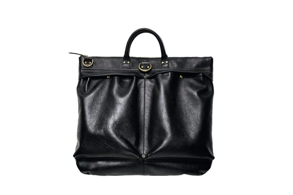 純国産の茶芯ホースハイドを使用したヘルメットバッグ。ミリタリー由来の武骨なデザインと茶芯レザーは相性抜群。横41、縦35cm。93,500円