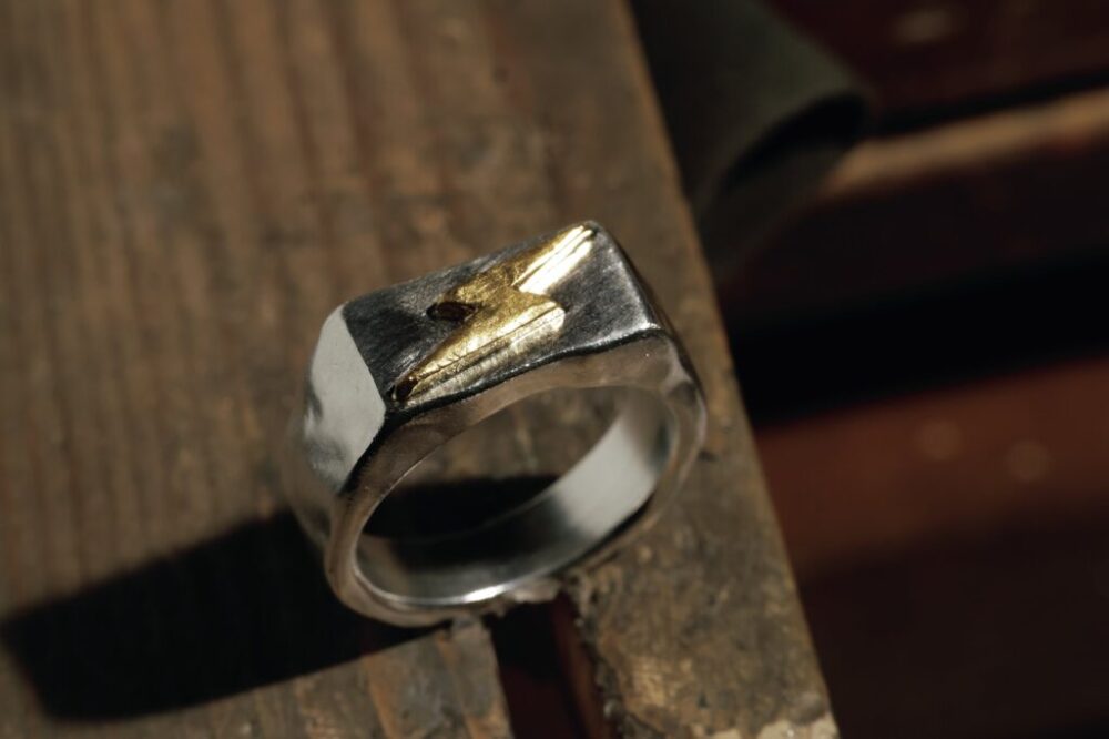 ライトニングを象徴する稲妻は分厚い純金、そしてリングには純銀を贅沢に使用したボリューム感のあるデザイン「PURE METAL RING」。121,000円