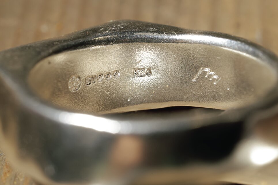 純金を意味する24K、純銀を意味するSV999が刻み込まれたリングの裏面。価格高騰が続く素材をふんだんに使うことで、武骨なデザインながら上品さも漂う。