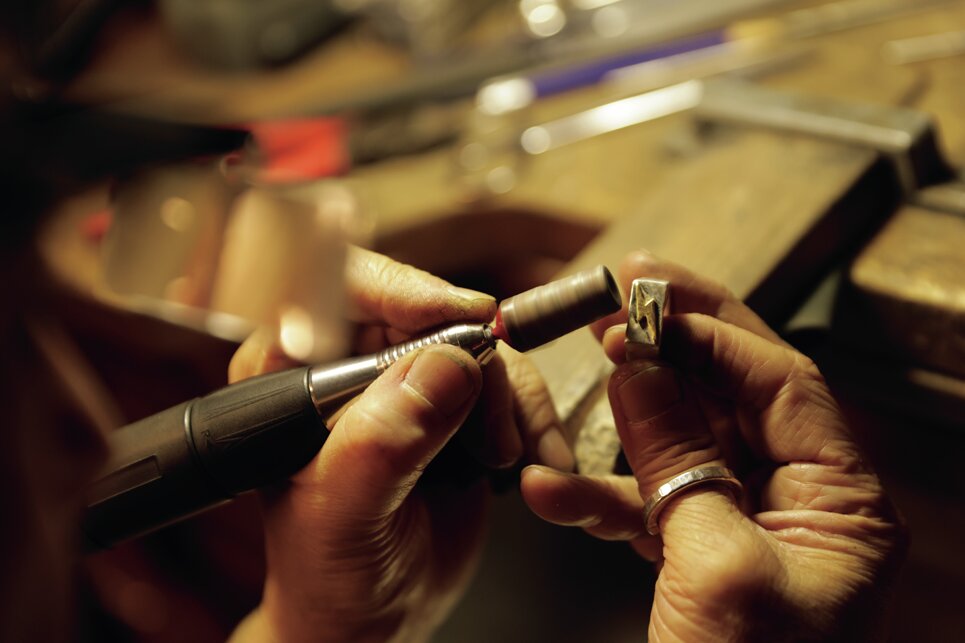 「なんか変わったシルバーだなーと思って何気なく手にした時に、これは純銀だと説明を受けて妙に腑に落ちたんだよね。普段から925や950ばかり目にしてきたから白っぽくて、輝きが強くて、違和感を感じたんだよね。それがきっかけでリングを買ったんだけど、アクセサリーといえば買っては家に置き去りの俺が、気づけば毎日つけている。それくらい指馴染みがいい。925や950と比べて黒ずみにくくて柔らかいのが特徴なんだけど、不精でエイジング好きの俺にはピッタリのシルバー。24Kの不変の輝きも験を担ぐタイプの俺にはピッタリ。次に会った時には稲妻モチーフで別注させてって頼み込んだっけ。聞けば美術家一家のような人が作っていて、そのクラフツマンシップの虜になってしまったんだよね」(編集長・松島親方)