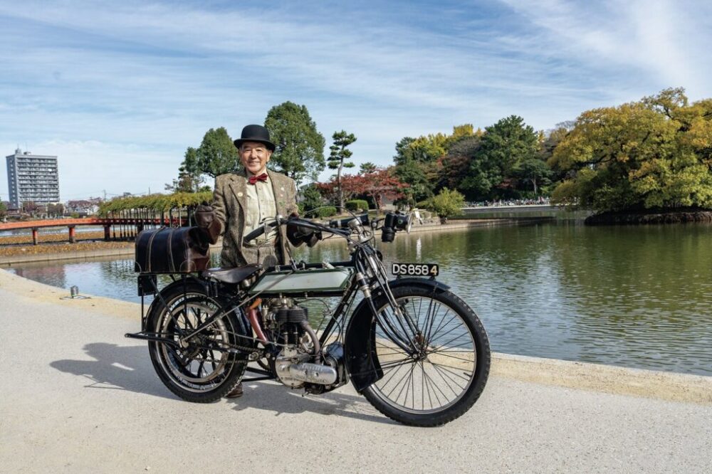 イギリスの工具メーカーとしてスタートし、1903年からバイクに着手したアビントン・キングディックの1911年が今回のイベントで最古のモデル。専用レバーを使って手動でクランクを回すアナログな始動が見所。ツイード・セットアップのコスチュームのマッチングも完璧。