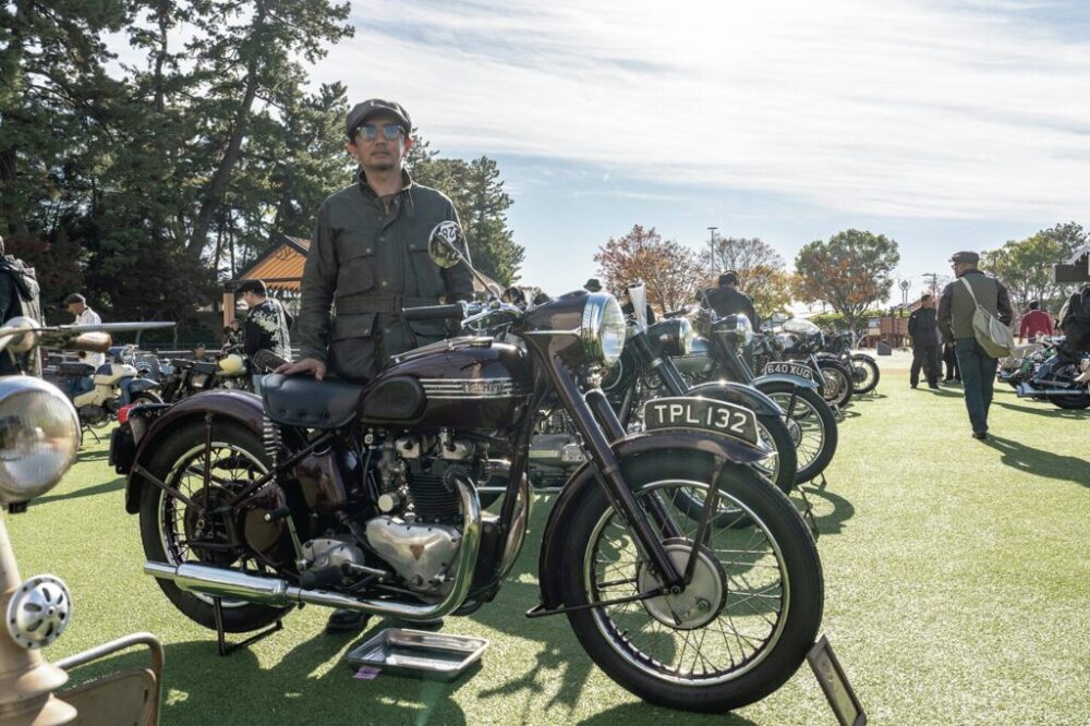 様々な旧車をコレクションする河合さんが持ち込んだ車両は、トライアンフの代名詞と言えるバーチカルツインエンジンを初めて搭載した5Tスピードツイン。アマランスレッドカラーが5Tのアイコンであり、フロントエンドにナセルを備える50s特有の装備も魅力。