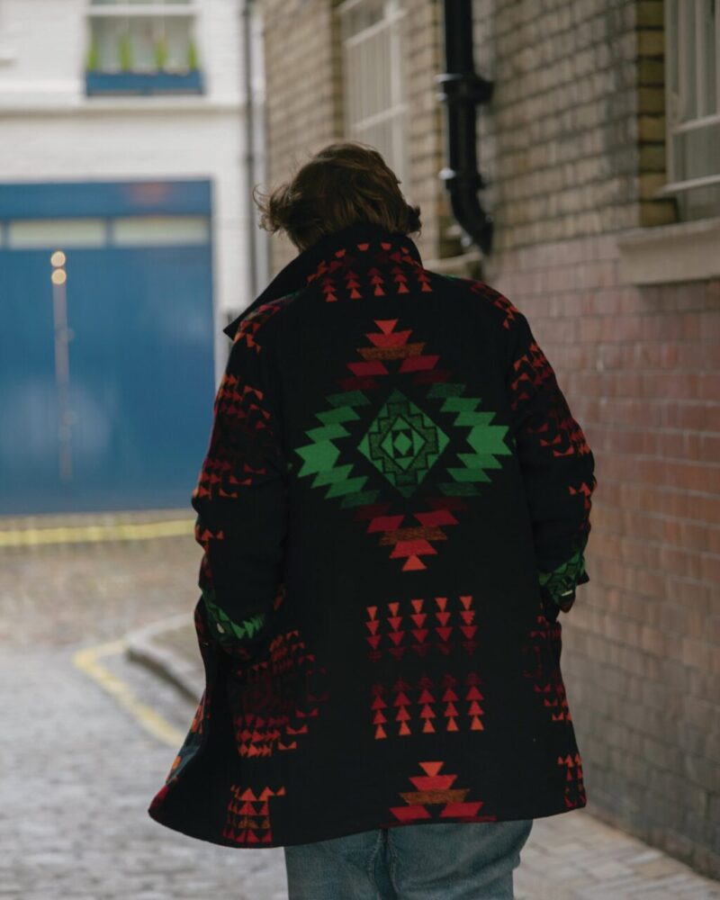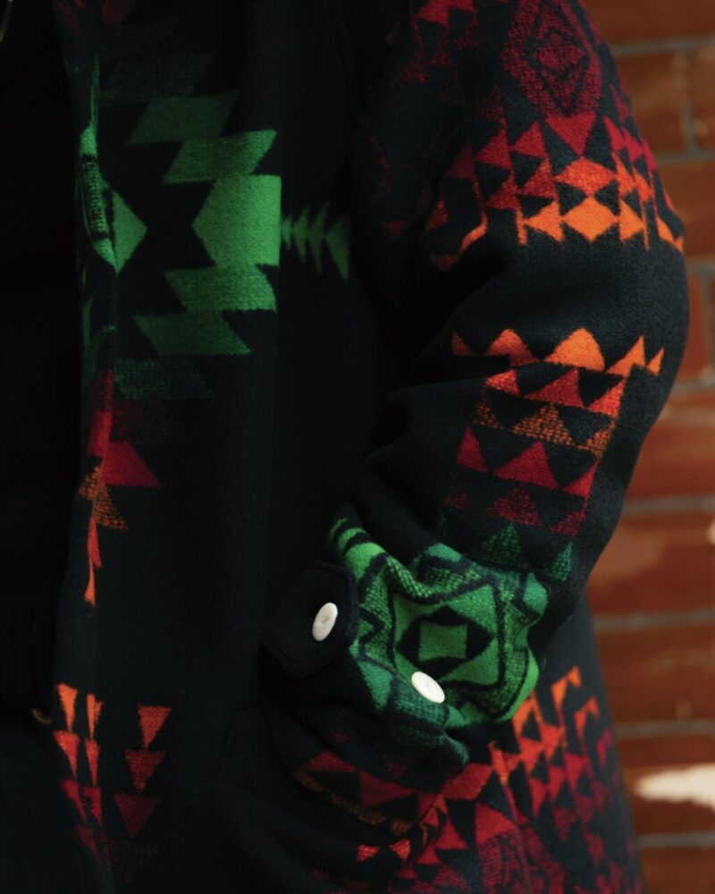 毎年のように秋冬コレクションでジェラードがリリースするネイティブアメリカンテイストのブランケットアイテム。今シーズンはコートとベストがリリースされた。生地製造から縫製まで日本国内で行われている。柄部分は何色もの糸でグラデーションが表現されている。様々な色の違う糸をセットして織機で織り上げる必要があるため、糸のセッティングだけでも膨大な時間を要する。143,000円〜(ジェラード・フラッグシップストア Tel.03-3464-0557 https://jelado.com)