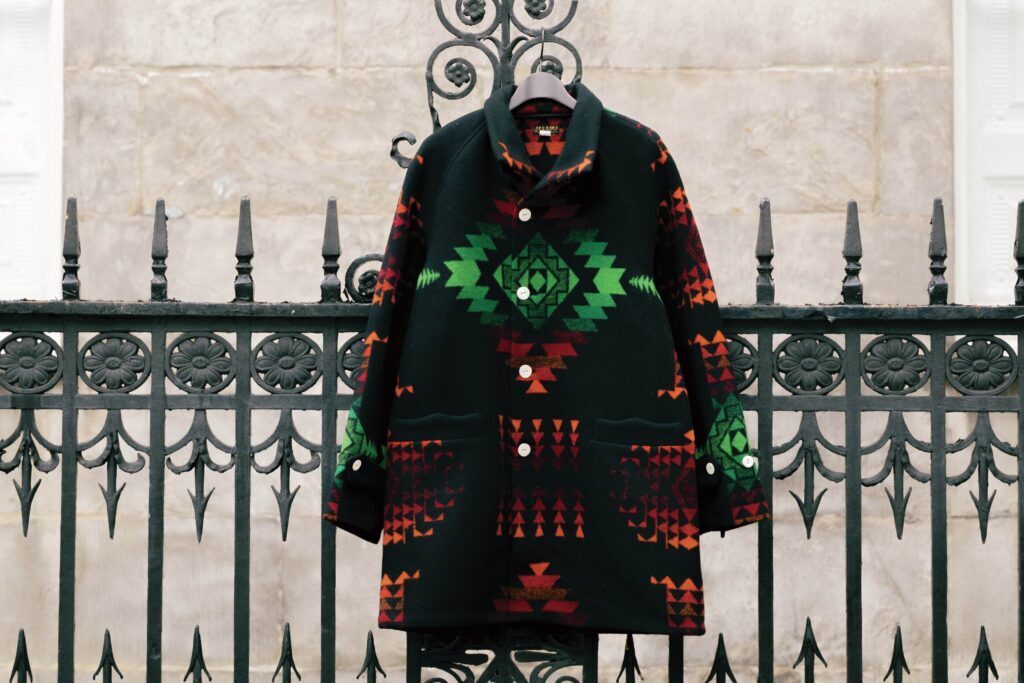毎年のように秋冬コレクションでジェラードがリリースするネイティブアメリカンテイストのブランケットアイテム。今シーズンはコートとベストがリリースされた。生地製造から縫製まで日本国内で行われている。柄部分は何色もの糸でグラデーションが表現されている。様々な色の違う糸をセットして織機で織り上げる必要があるため、糸のセッティングだけでも膨大な時間を要する。143,000円〜(ジェラード・フラッグシップストア Tel.03-3464-0557 https://jelado.com)