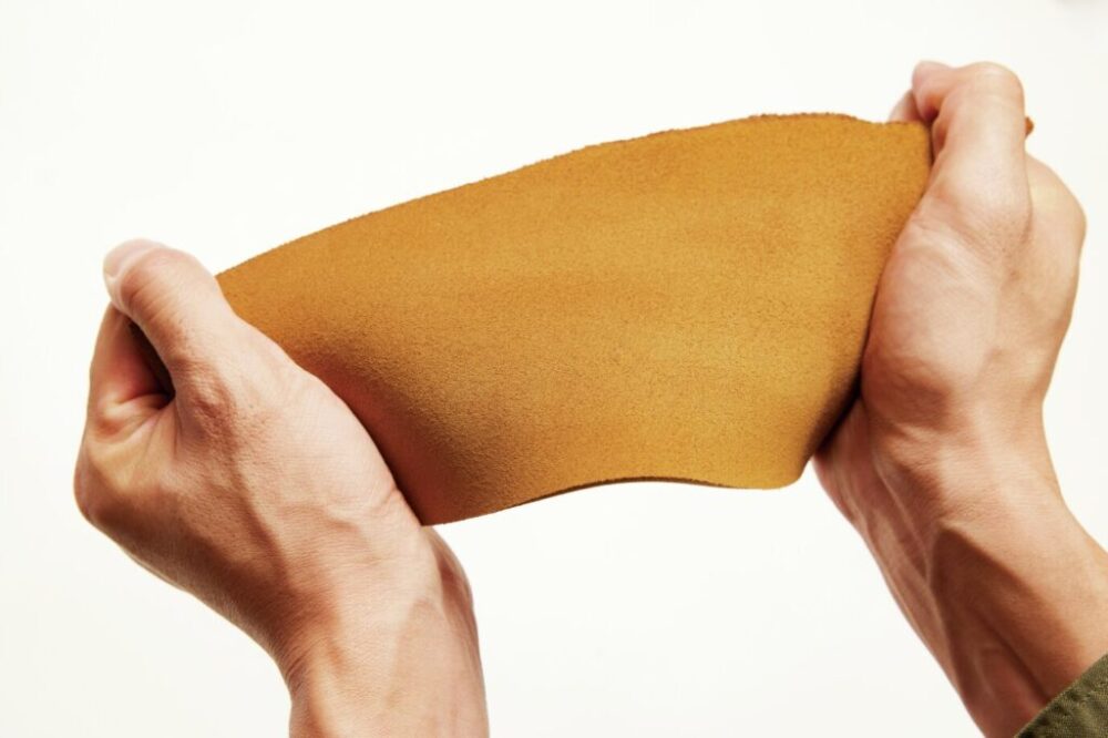アッパーがスウェードやラフアウトのシューズが多く存在するのは言わずもがな、スムースレザーを採用しているシューズにおいても、ヒールや履き口の補強パーツとしてスウェードが貼られているようなプロダクトも多数存在する。やや厚みのあるスウェードは写真のように両側から全力で引っ張っても破れる気配がまるでなく、普通のハサミではきることができないほどの強度を誇る。