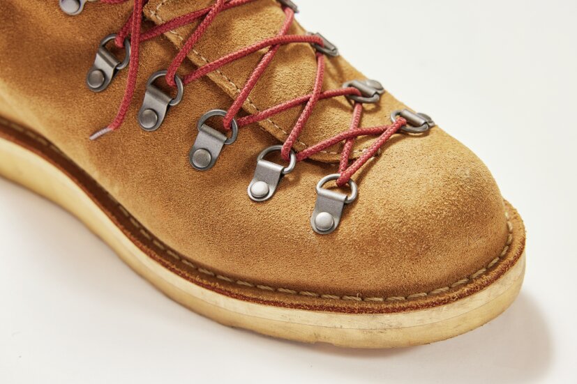 スウェードやラフアウトがワークブーツやマウンテンシューズなどに多くみられる理由は強度に優れているから。革のなかで最も強度が高いと言われているのが銀面(表革)であり、その裏側であるスウェードは同じく強度が高く、毛足があることでひび割れが起きにくいという点もポイントだ。