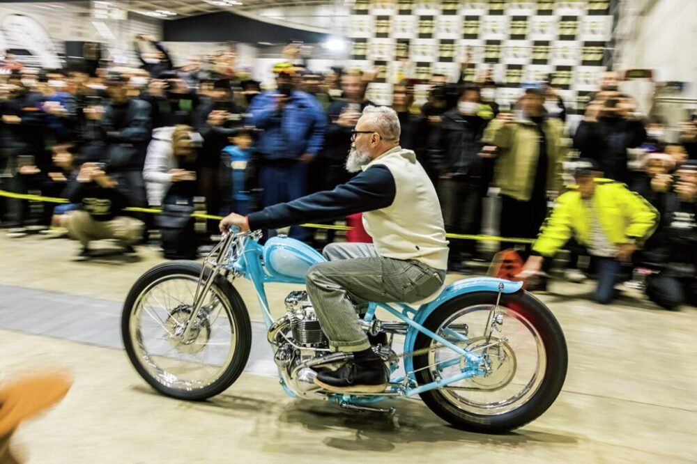 ライドインでは昨年のBEST OF SHOW受賞車両や海外ゲストの車両などが入場した。ブルーのトライアンフは、Weems MotorsのJared Weemsが乗る1952年式”Ultor”