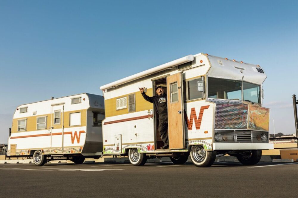 四角いのにどこか可愛らしいデザインの1968年式ウイネベーゴC16キャンパーで同じくウイネベーゴ製の217 1/2Tトラベルトレーラーを牽引した驚きのスタイルで会場を沸かせたコイモータースの小泉さん。内部は旧いキッチンやクローゼットをすべて取り外した上で、板張りの広い空間に大変身。ここにコの字型のソファを設置し、これがこのまま巨大ベッドになる仕組み。ちなみにエンジンは350ciのV8で3速ATの組み合わせ。フロントにはディスプブレーキを装着し、ちゃんと走るようになっているのもポイント! ウイネベーゴC16はその名の通り全長16フィート(約4.9m)、これに全長17.5フィート(約5.3m)の217 1/2Tトレーラーを牽引。どちらも短いが合計の全長は10mオーバー!