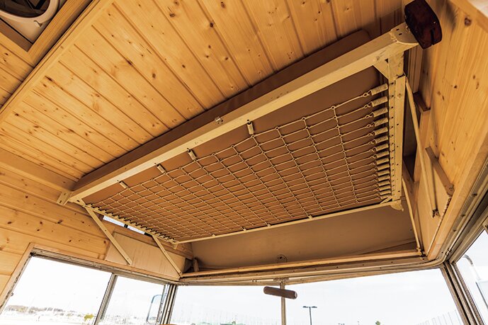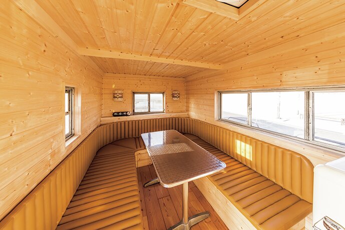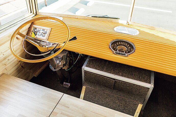 内装はすべて外した上で新たに板張りとし、コの字型にソファを設置。これが夜には巨大なベッドになる仕組み。運転席上には昇降式のベッドが備わる。ダッシュは完全に作り直し。メーターは1956年オールズモービル用で、ステアリングはシボレーC10のデラックス用。