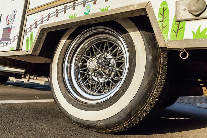 ホイールはスターワイヤーで6輪とも同じホイールでコーディネート。フェンダーアーチが小さいため、タイヤの脱着にはコツが必要。