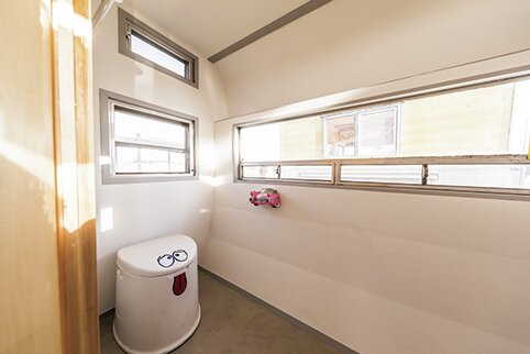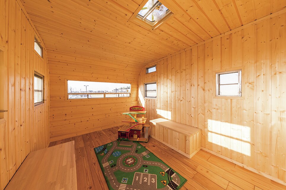 トレーラーの内部も同じ板張りとし、こちらは前側に別室を設け将来的にトイレとシャワーを設置する予定。後ろ側はあえて何にも設置せず、子供達のプレイルームとして活用。