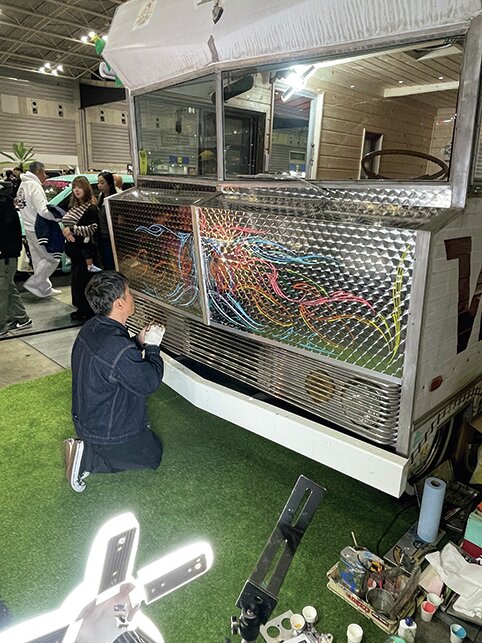 フロントパネル部分は腐食していたため、鱗ステン板で新規に制作。ここに会場で総勢22名のアーティストがピンストライプセッションを開催。贅沢な世界にひとつだけの装飾となった。