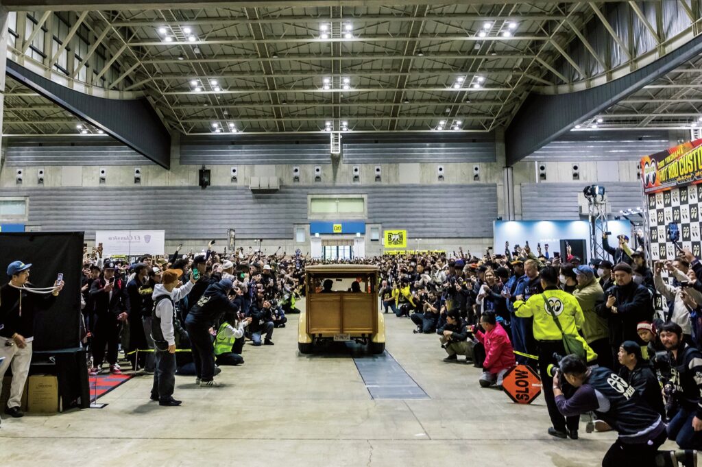 今年もイベントはライドインショーでスタート。海外ゲストはもちろん、今年はホットロッドショップP「デュースファクトリー」40周年を記念して、代表の笠井氏が所有する32年フォードのウッディワゴン、バイクではボーンフリーを勝ち抜いたカスタムやメーカーが企画したオフィシャルカスタムバイクなどもライドインを果たした。