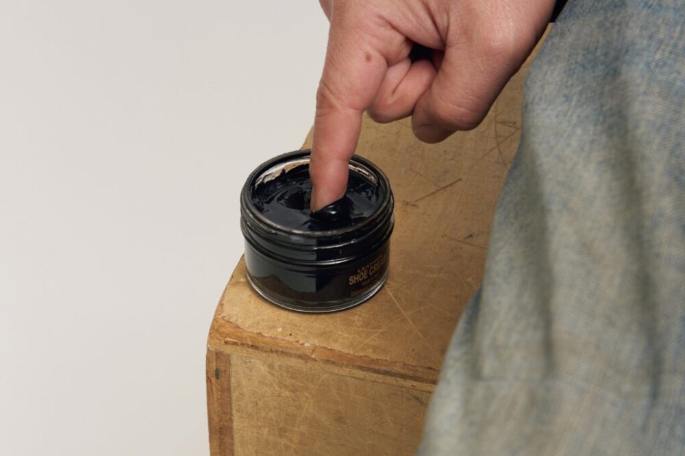 モヒカン小川は手で塗る方を好むが、手を汚したくない方には、ブーツ用のクロスを使用して磨くことをおすすめする。適量を手に取り、補色したい箇所の外側から少しずつクリームを内側に塗りこんでいくイメージで。このとき、塗りこむ面積に対して多く塗布してしまうと乾きづらいので注意すべし。塗布が完了したら、日の当たらない、風通しのいい場所でしばらく放置しよう。
