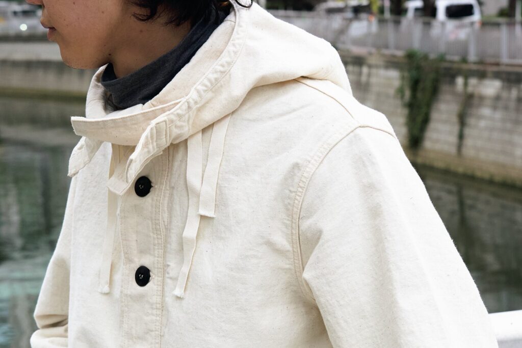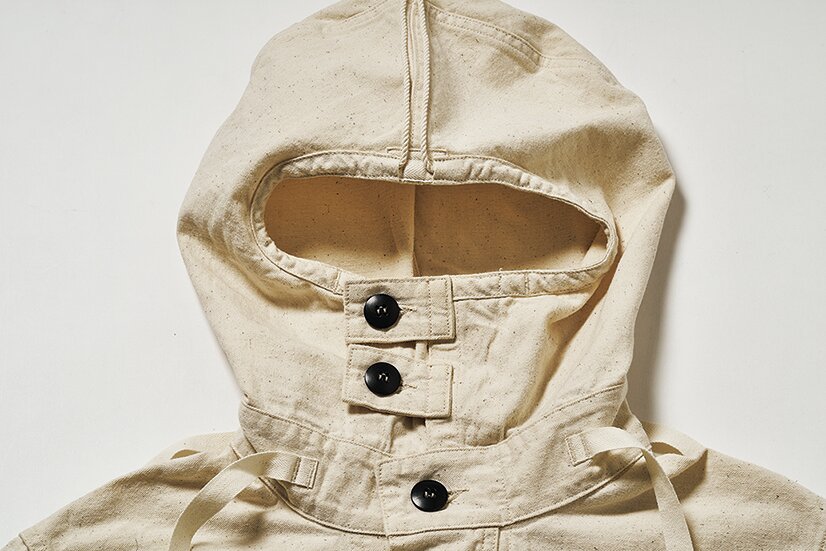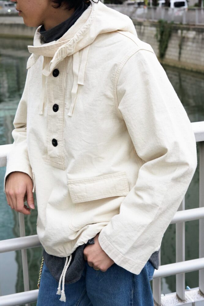 USNセーラーズパーカは、海軍艦船内で清掃や整備作業時に制服の上から着用された「USN除染スーツトップ」を再現したモデル。防水性や耐薬品性を高めるため船上でオーバーダイされた背景を持ち、余剰品が再染色された個体も存在する。本作はオリジナルの生成りツイルに、黒のボタンで端正に仕上げた。染めやステンシルを施し、自分だけの色に育てられる。52,800円(ウエアハウス東京店 Tel.03-5457-7899 https://www.ware-house.co.jp)