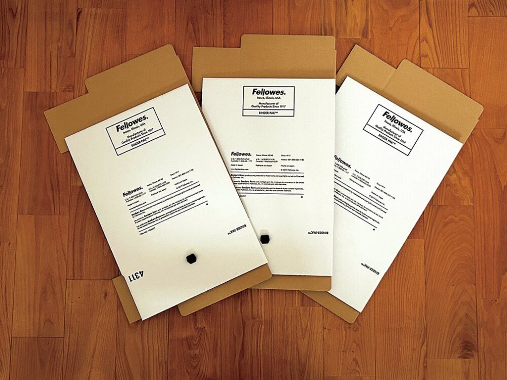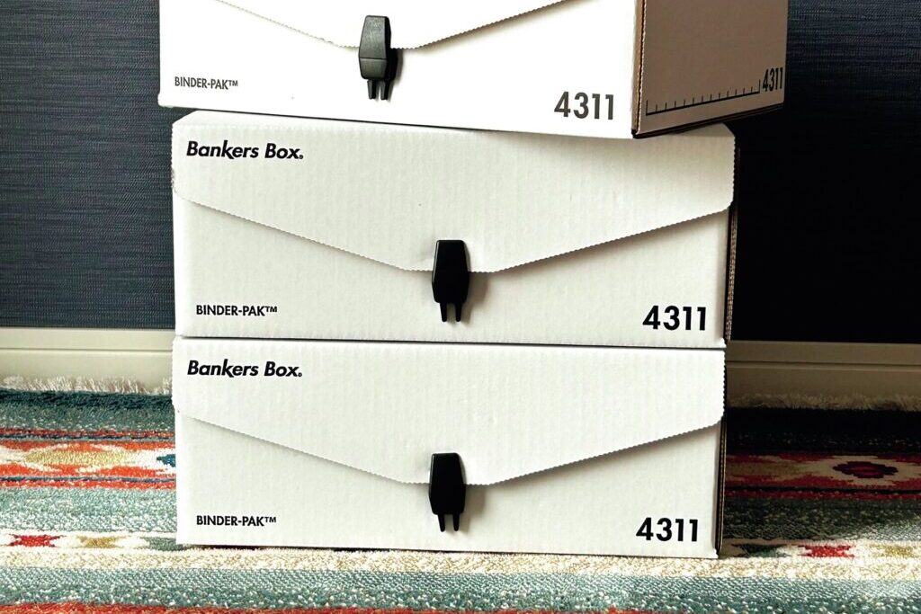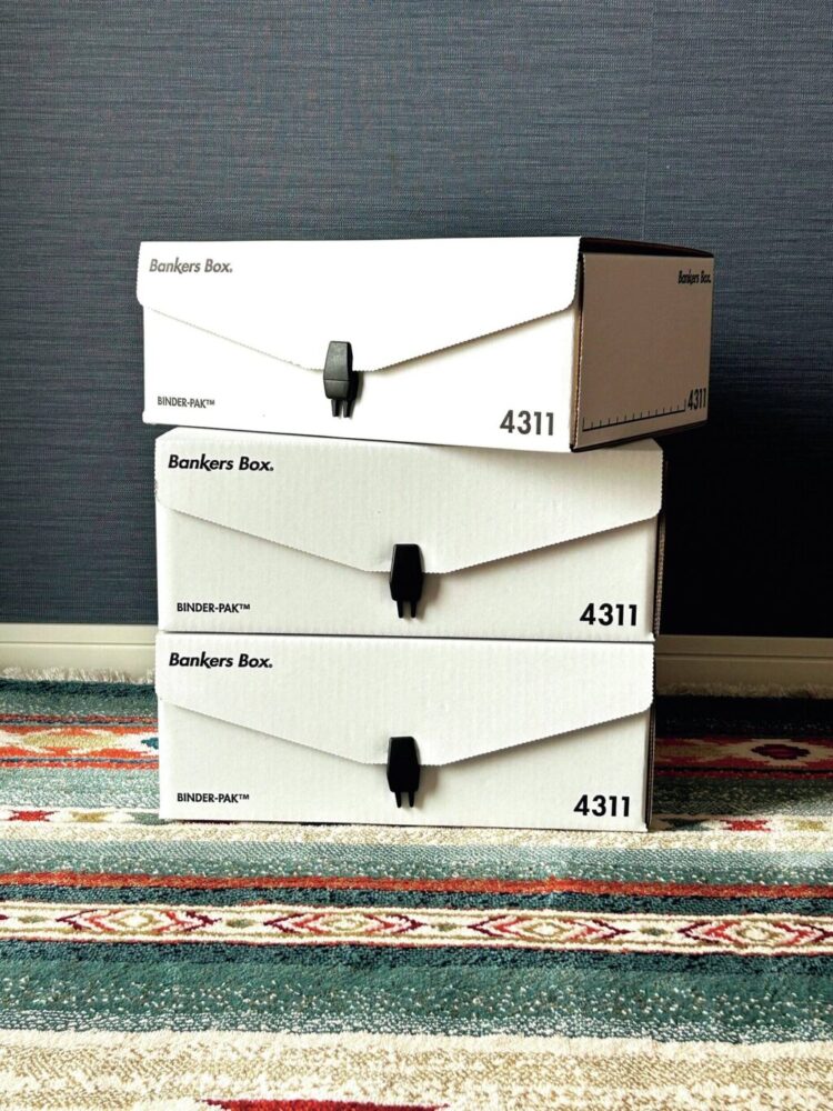 実はバンカーズボックスの愛用者。自宅のスチール棚の上から下まで収納箱としてバンカーズボックスが積み重なっている。蓋がしっかり固定できる上、深すぎない高さのバインダーパックは、収納場所に困っていた請求書や領収書の保管にちょうどいい。
