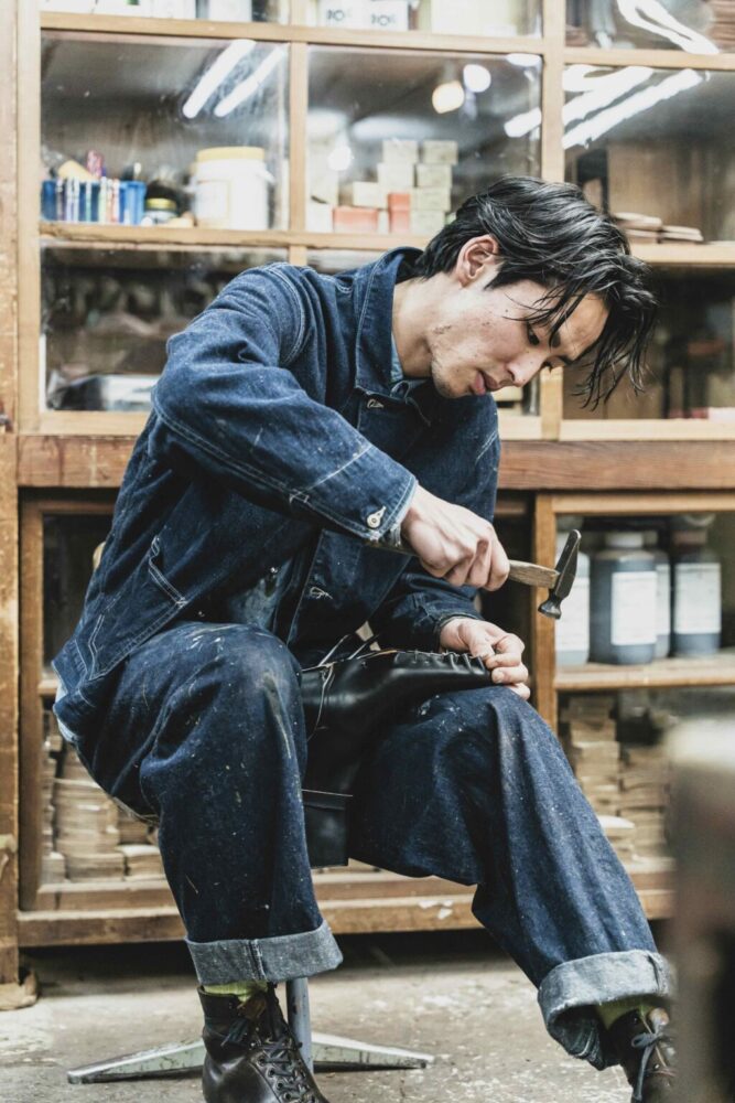 「Brass shoe co.」靴職人・渡邉夏生さん|スポーツメーカーを経て、ブラスシューカンパニーに入社するという異色の経歴を持つ。リペアからハンドソーンウェルテッドの縫製作業まで行う腕利きの職人。プライベートではフットサルが趣味である。