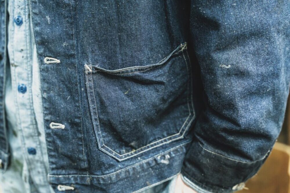 「これは弊社で働く職人のために作れられたBSCユニフォーム。快適に仕事をするためのパターンであることは言わずもがな、耐久性や長く使い、汚れたり、破れて修理しても愛着が湧くようなものづくりを目指しています。例えばこのカバーオールは座って作業することがメインなので、もたつかないショート丈かつ動きやすいライトオンスのデニムになっています。またカバーオールと言えば、4つポケットが代表的ですが、ポケットに収納する道具は少ないのでミニマルな2つポケットに。普段の洋服と違って、汚れなどはまったく気にしませんし、普通に洗濯するのでエイジングもかなり早いんです(笑)。実力派ブランドであるオールドジョーに依頼しているので、ファッションとしても優秀な自慢のユニフォームです」